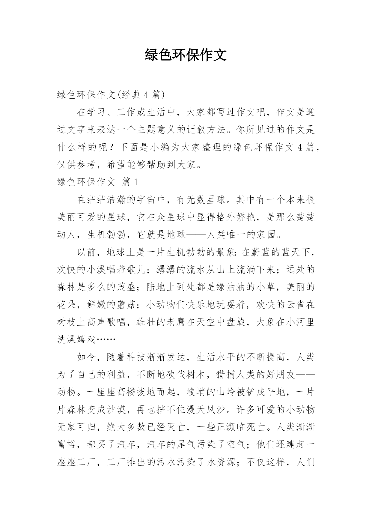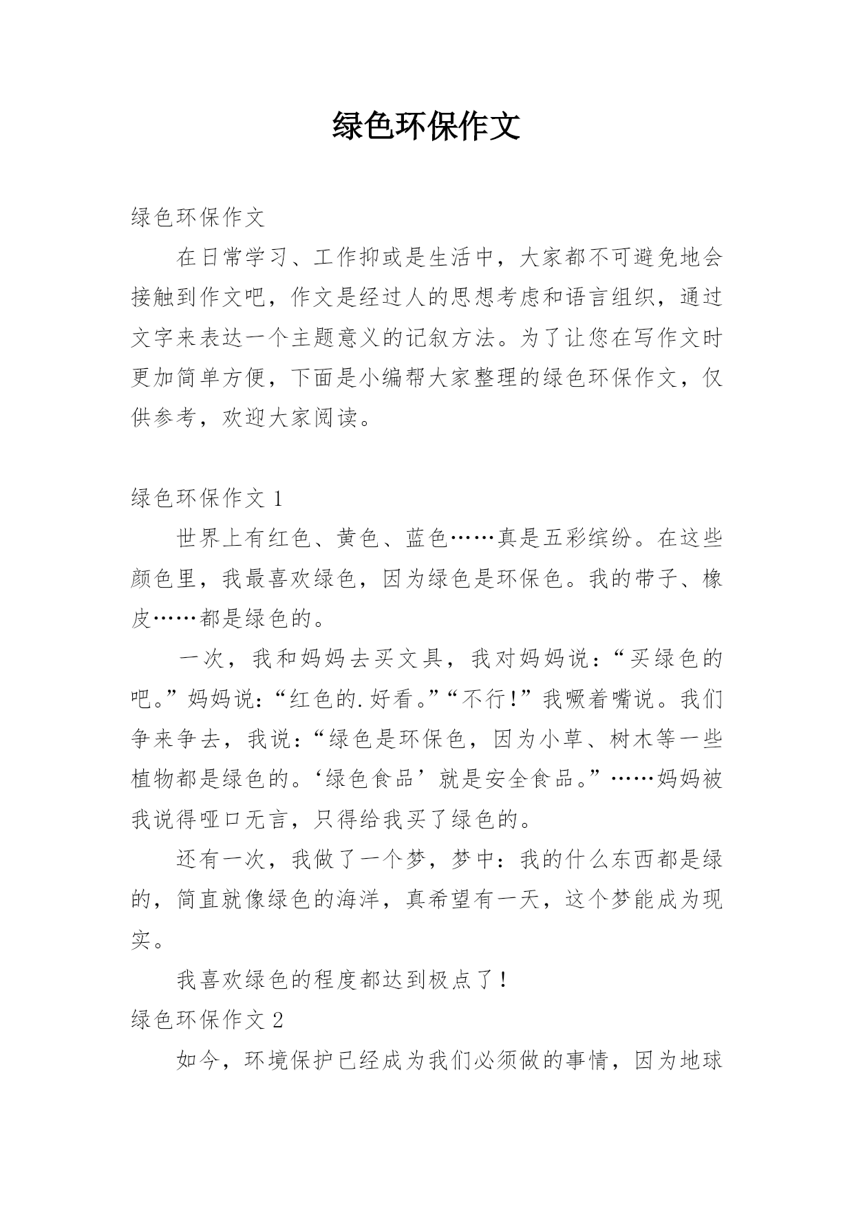 绿色环保作文绿色环保作文在日常学习、工作抑或是生活中,大家都不可避免地会接触到作文吧,作文是经过人的思想考虑和语言组织,通过文字来表达一个主题意义的记叙方法。为了让您在写作文时更加简单方便,下面是小编帮大家整理的绿色环保作文,仅供参考,欢迎大家阅读。绿色环保作文1世界上有红色、黄色、蓝色……真是五彩缤纷。在这些颜色里,我最喜欢绿色,因为绿色是环保色。我的带子、橡皮……都是绿色的。一次,我和妈妈去买文具,我对妈妈说:“买绿色的吧。”妈妈说:“红色的.好看。”“不行!”我噘着嘴说。我们争来争去,我说:“绿色是