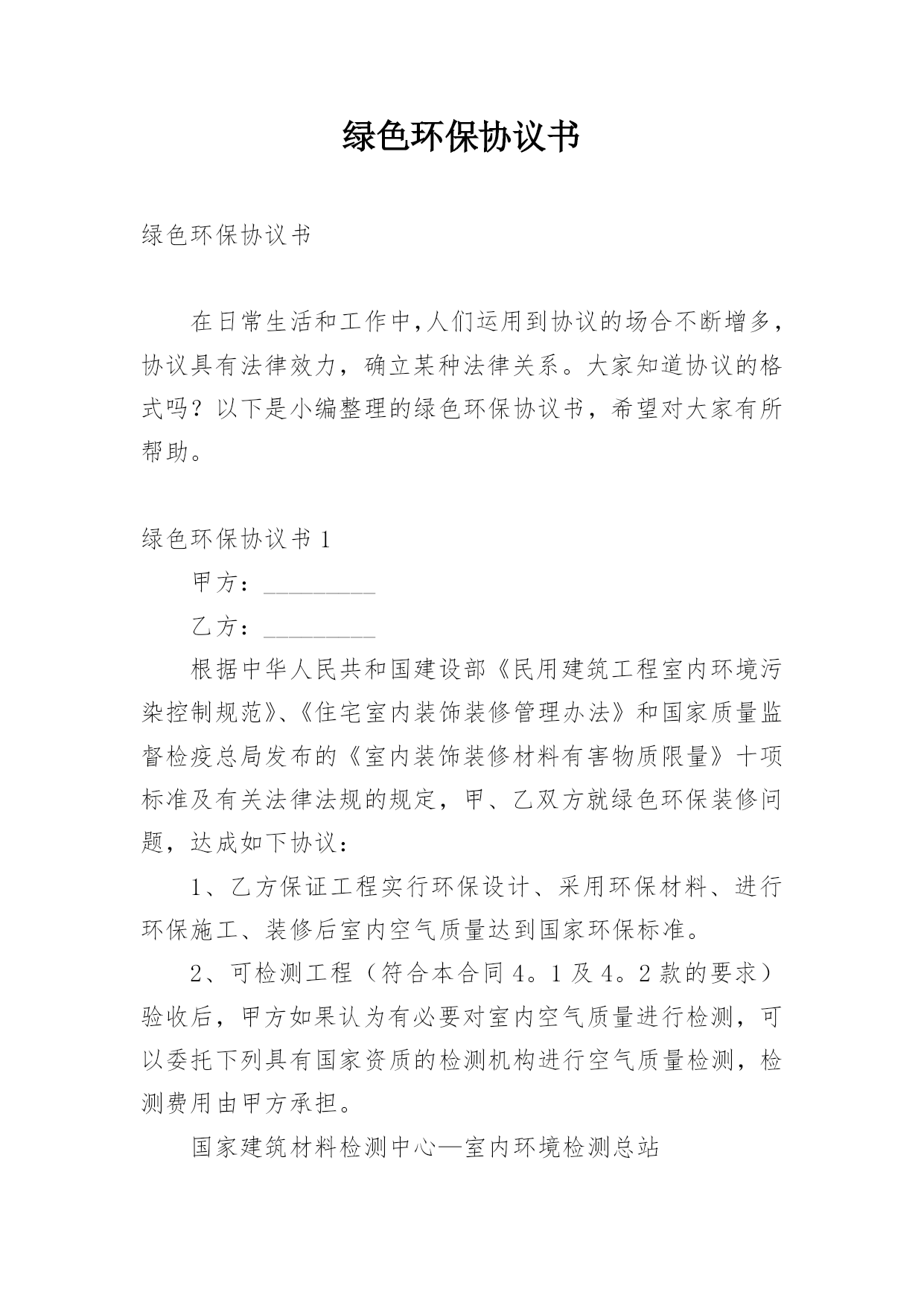 绿色环保协议书绿色环保协议书在日常生活和工作中,人们运用到协议的场合不断增多,协议具有法律效力,确立某种法律关系。大家知道协议的格式吗?以下是小编整理的绿色环保协议书,希望对大家有所帮助。绿色环保协议书1甲方:_________乙方:_________根据中华人民共和国建设部《民用建筑工程室内环境污染控制规范》、《住宅室内装饰装修管理办法》和国家质量监督检疫总局发布的《室内装饰装修材料有害物质限量》十项标准及有关法律法规的规定,甲、乙双方就绿色环保装修问题,达成如下协议:1、乙方保证工程实行环保设计、采用