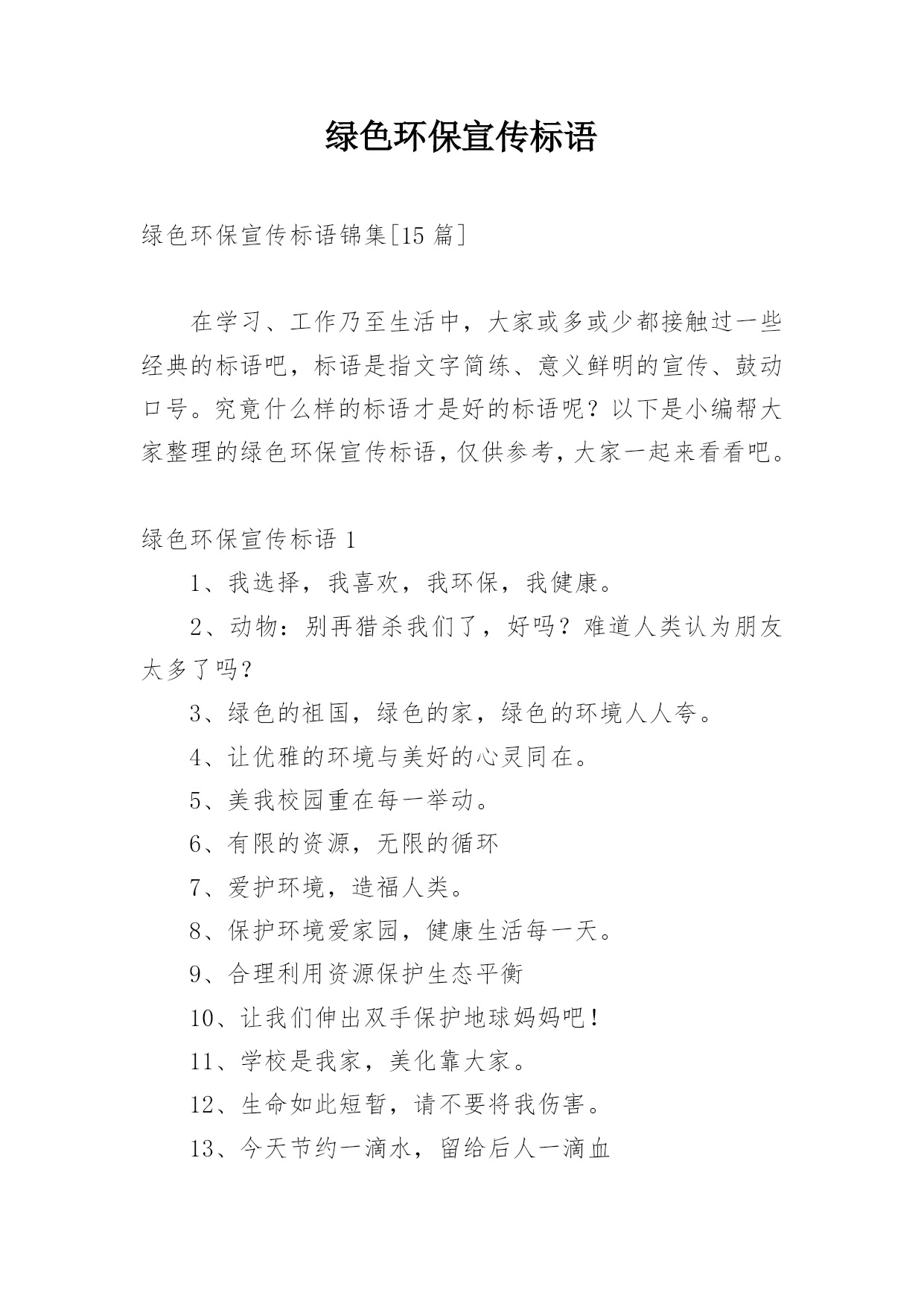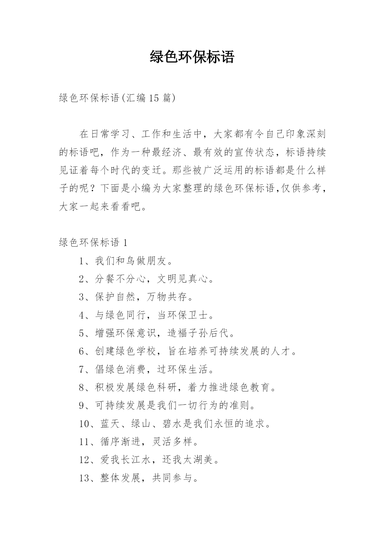 绿色环保标语绿色环保标语15篇在学习、工作乃至生活中,许多人都接触过一些比较经典的标语吧,作为一种最经济、最有效的宣传状态,标语持续见证着每个时代的变迁。那么都有哪些类型的标语呢?下面是小编收集整理的绿色环保标语,欢迎大家借鉴与参考,希望对大家有所帮助。绿色环保标语1●创造优美环境。●倡导绿色生活。●环保成就健康生活。●水污染的危害及防治。●环保--成就健康生活。●人人参与常见绿色家园。●噪声污染的危害及防治。●大气污染的危害及防治。●环保——成就健康生活。●人人参与,创建绿色家园。●发展经济,不能以牺牲