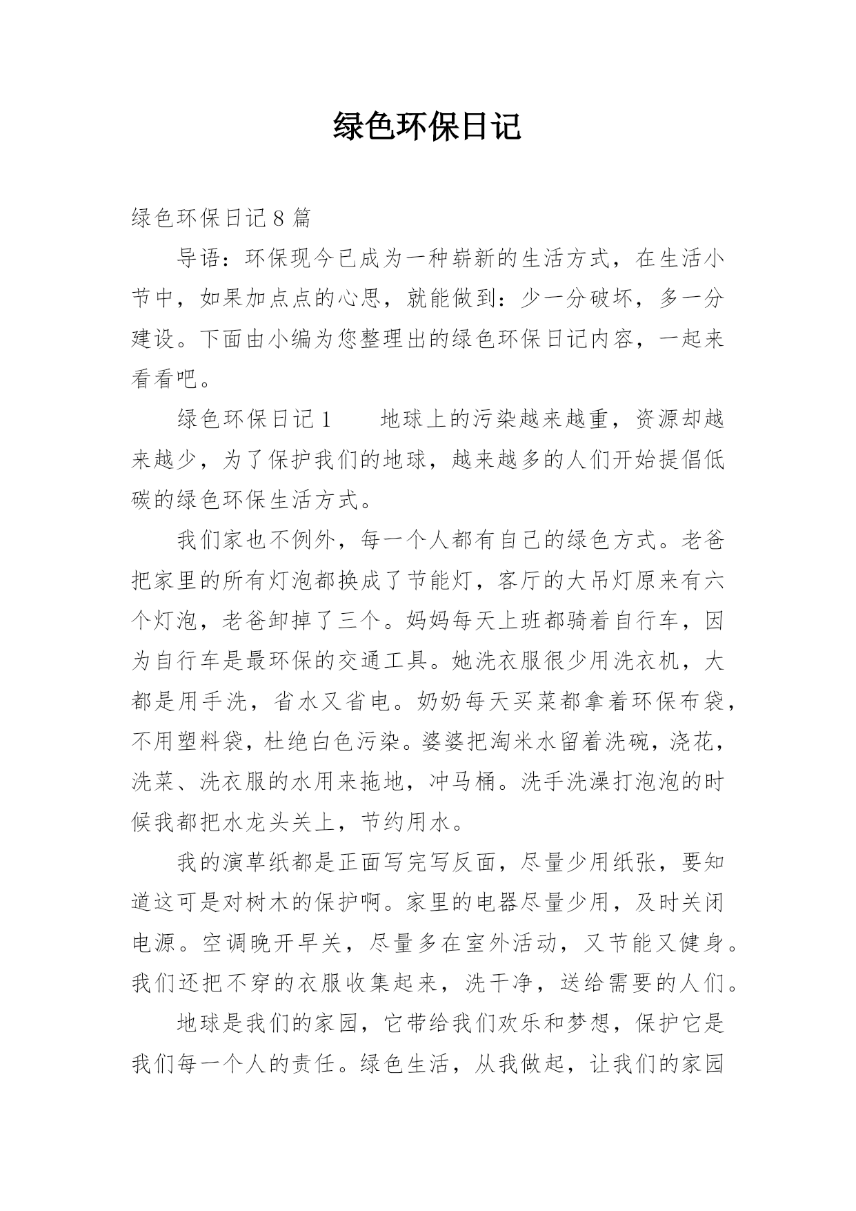 绿色环保日记绿色环保日记8篇导语:环保现今已成为一种崭新的生活方式,在生活小节中,如果加点点的心思,就能做到:少一分破坏,多一分建设。下面由小编为您整理出的绿色环保日记内容,一起来看看吧。绿色环保日记1地球上的污染越来越重,资源却越来越少,为了保护我们的地球,越来越多的人们开始提倡低碳的绿色环保生活方式。我们家也不例外,每一个人都有自己的绿色方式。老爸把家里的所有灯泡都换成了节能灯,客厅的大吊灯原来有六个灯泡,老爸卸掉了三个。妈妈每天上班都骑着自行车,因为自行车是最环保的交通工具。她洗衣服很少用洗衣机,大