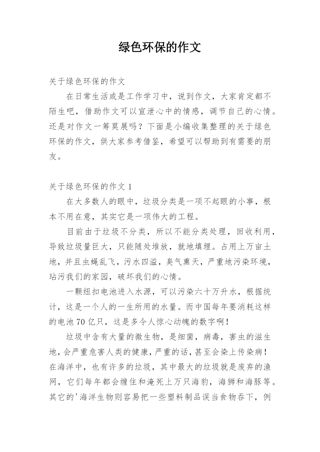绿色环保的作文关于绿色环保的作文在日常生活或是工作学习中,说到作文,大家肯定都不陌生吧,借助作文可以宣泄心中的情感,调节自己的心情。还是对作文一筹莫展吗?下面是小编收集整理的关于绿色环保的作文,供大家参考借鉴,希望可以帮助到有需要的朋友。关于绿色环保的作文1在大多数人的眼中,垃圾分类是一项不起眼的小事,根本不用在意,其实它是一项伟大的工程。目前由于垃圾不分类,所以不能分类处理,回收利用,导致垃圾量巨大,只能随处堆放,就地填埋。占用上万亩土地,并且虫蝇乱飞,污水四溢,臭气熏天,严重地污染环境,玷污我们的家园