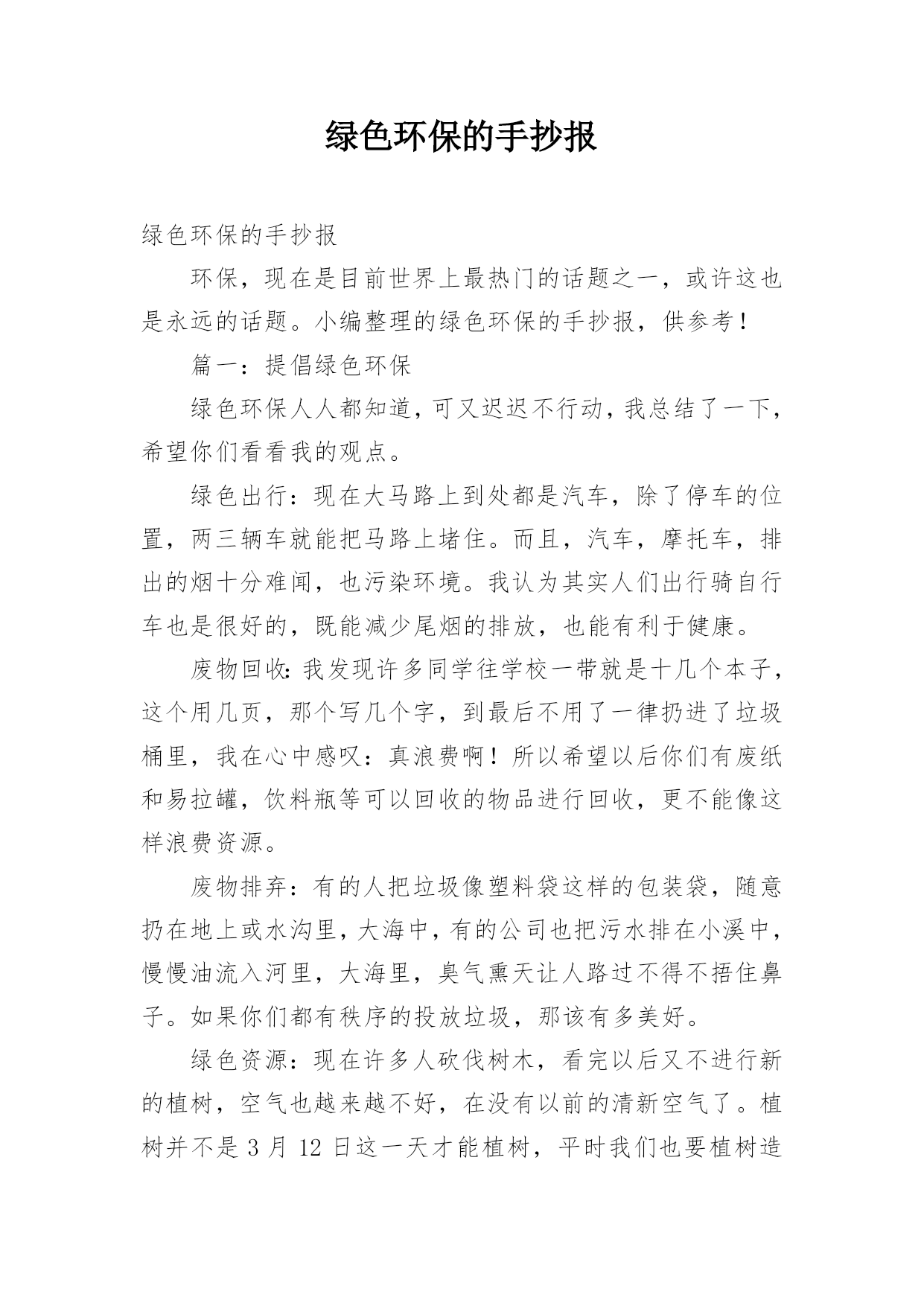 绿色环保的手抄报绿色环保的手抄报环保,现在是目前世界上最热门的话题之一,或许这也是永远的话题。小编整理的绿色环保的手抄报,供参考!篇一:提倡绿色环保绿色环保人人都知道,可又迟迟不行动,我总结了一下,希望你们看看我的观点。绿色出行:现在大马路上到处都是汽车,除了停车的位置,两三辆车就能把马路上堵住。而且,汽车,摩托车,排出的烟十分难闻,也污染环境。我认为其实人们出行骑自行车也是很好的,既能减少尾烟的排放,也能有利于健康。废物回收:我发现许多同学往学校一带就是十几个本子,这个用几页,那个写几个字,到最后不用了