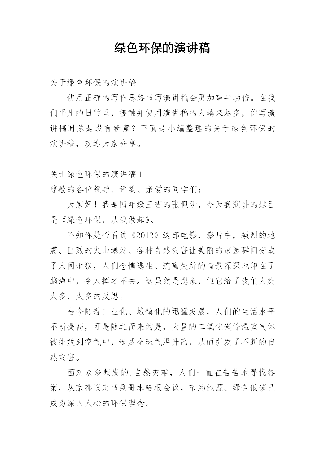 绿色环保的演讲稿关于绿色环保的演讲稿使用正确的写作思路书写演讲稿会更加事半功倍。在我们平凡的日常里,接触并使用演讲稿的人越来越多,你写演讲稿时总是没有新意?下面是小编整理的关于绿色环保的演讲稿,欢迎大家分享。关于绿色环保的演讲稿1尊敬的各位领导、评委、亲爱的同学们:大家好!我是四年级三班的张佩研,今天我演讲的题目是《绿色环保,从我做起》。不知你是否看过《2012》这部电影,影片中,强烈的地震、巨烈的火山爆发、各种自然灾害让美丽的家园瞬间变成了人间地狱,人们仓惶逃生、流离失所的情景深深地印在了脑海中,令人挥