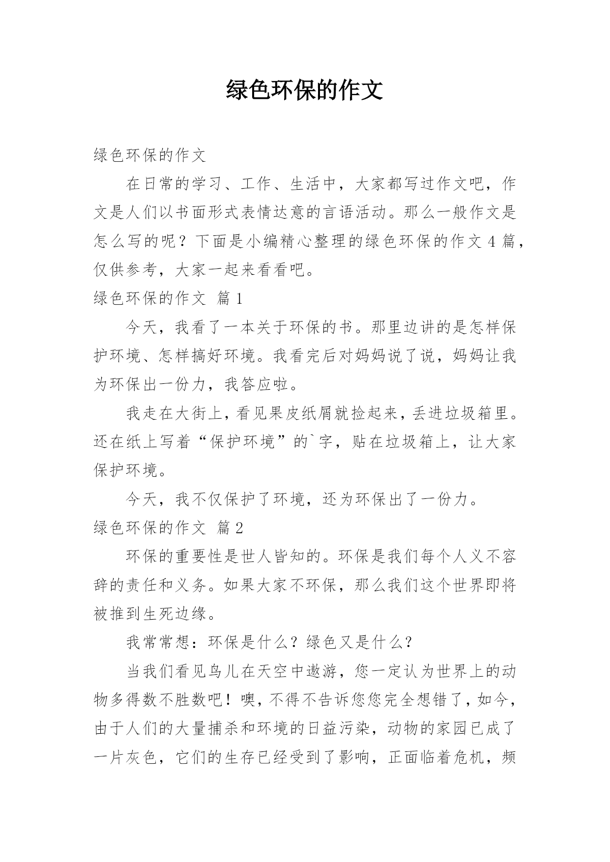 绿色环保的作文绿色环保的作文在日常的学习、工作、生活中,大家都写过作文吧,作文是人们以书面形式表情达意的言语活动。那么一般作文是怎么写的呢?下面是小编精心整理的绿色环保的作文4篇,仅供参考,大家一起来看看吧。绿色环保的作文篇1今天,我看了一本关于环保的书。那里边讲的是怎样保护环境、怎样搞好环境。我看完后对妈妈说了说,妈妈让我为环保出一份力,我答应啦。我走在大街上,看见果皮纸屑就捡起来,丢进垃圾箱里。还在纸上写着“保护环境”的`字,贴在垃圾箱上,让大家保护环境。今天,我不仅保护了环境,还为环保出了一份力。绿