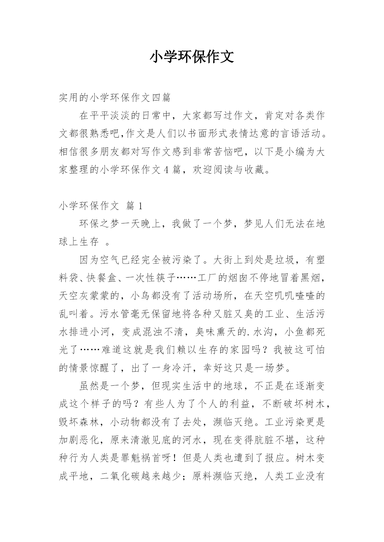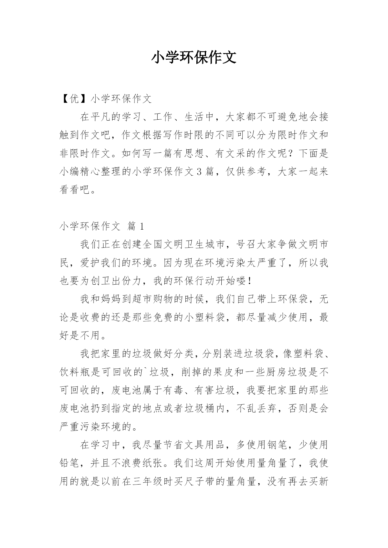 小学环保作文【优】小学环保作文在平凡的学习、工作、生活中,大家都不可避免地会接触到作文吧,作文根据写作时限的不同可以分为限时作文和非限时作文。如何写一篇有思想、有文采的作文呢?下面是小编精心整理的小学环保作文3篇,仅供参考,大家一起来看看吧。小学环保作文篇1我们正在创建全国文明卫生城市,号召大家争做文明市民,爱护我们的环境。因为现在环境污染太严重了,所以我也要为创卫出份力,我的环保行动开始喽!我和妈妈到超市购物的时候,我们自己带上环保袋,无论是收费的还是那些免费的小塑料袋,都尽量减少使用,最好是不用。我把