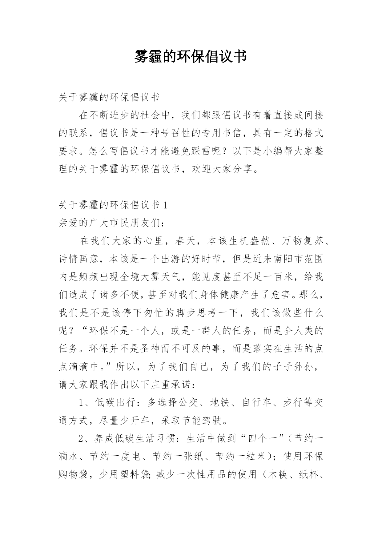 雾霾的环保倡议书关于雾霾的环保倡议书在不断进步的社会中,我们都跟倡议书有着直接或间接的联系,倡议书是一种号召性的专用书信,具有一定的格式要求。怎么写倡议书才能避免踩雷呢?以下是小编帮大家整理的关于雾霾的环保倡议书,欢迎大家分享。关于雾霾的环保倡议书1亲爱的广大市民朋友们:在我们大家的心里,春天,本该生机盎然、万物复苏、诗情画意,本该是一个出游的好时节,但是近来南阳市范围内是频频出现全境大雾天气,能见度甚至不足一百米,给我们造成了诸多不便,甚至对我们身体健康产生了危害。那么,我们是不是该停下匆忙的脚步思考一