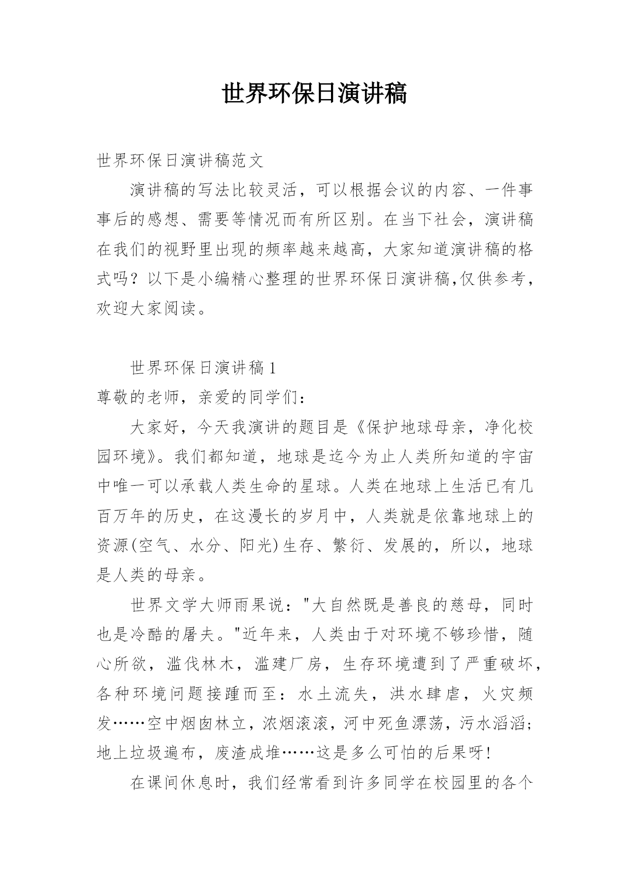 世界环保日演讲稿世界环保日演讲稿范文演讲稿的写法比较灵活,可以根据会议的内容、一件事事后的感想、需要等情况而有所区别。在当下社会,演讲稿在我们的视野里出现的频率越来越高,大家知道演讲稿的格式吗?以下是小编精心整理的世界环保日演讲稿,仅供参考,欢迎大家阅读。世界环保日演讲稿1尊敬的老师,亲爱的同学们:大家好,今天我演讲的题目是《保护地球母亲,净化校园环境》。我们都知道,地球是迄今为止人类所知道的宇宙中唯一可以承载人类生命的星球。人类在地球上生活已有几百万年的历史,在这漫长的岁月中,人类就是依靠地球上的资源(