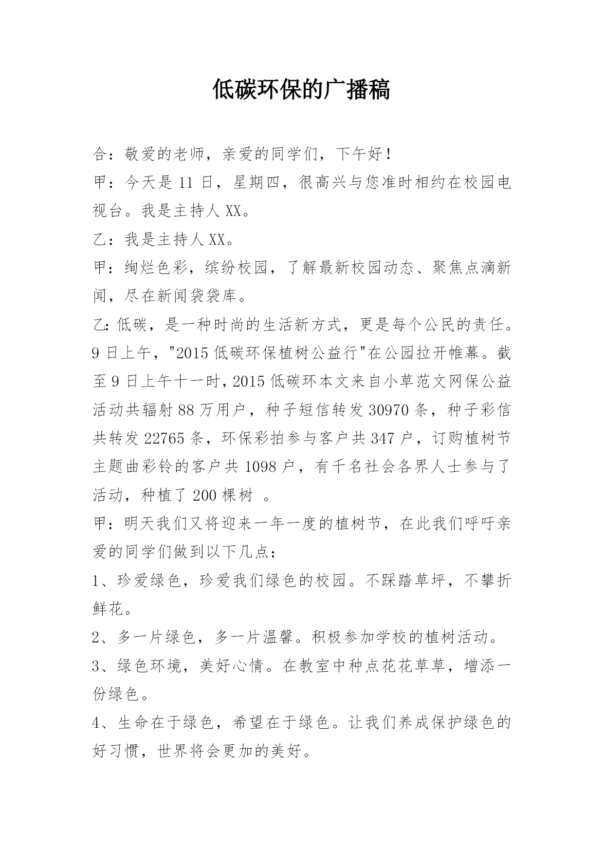 低碳环保的广播稿合:敬爱的老师,亲爱的同学们,下午好!甲:今天是11日,星期四,很高兴与您准时相约在校园电视台。我是主持人XX。乙:我是主持人XX。甲:绚烂色彩,缤纷校园,了解最新校园动态、聚焦点滴新闻,尽在新闻袋袋库。乙:低碳,是一种时尚的生活新方式,更是每个公民的责任。9日上午,"2015低碳环保植树公益行"在公园拉开帷幕。截至9日上午十一时,2015低碳环本文来自小草范文网保公益活动共辐射88万用户,种子短信转发30970条,种子彩信共转发22765条,环保彩拍参与客户共347户,订购植树节主题曲彩