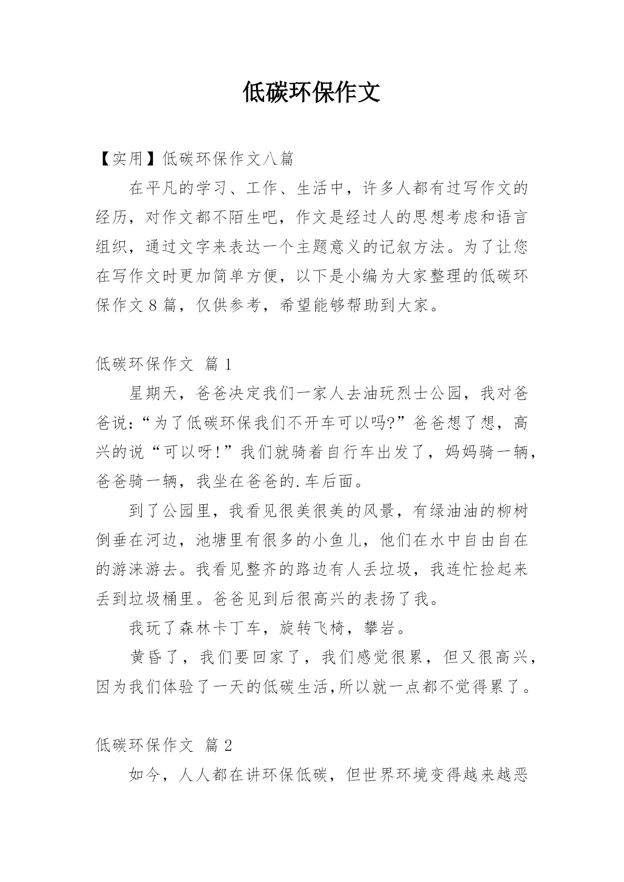 低碳环保作文【实用】低碳环保作文八篇在平凡的学习、工作、生活中,许多人都有过写作文的经历,对作文都不陌生吧,作文是经过人的思想考虑和语言组织,通过文字来表达一个主题意义的记叙方法。为了让您在写作文时更加简单方便,以下是小编为大家整理的低碳环保作文8篇,仅供参考,希望能够帮助到大家。低碳环保作文篇1星期天,爸爸决定我们一家人去油玩烈士公园,我对爸爸说:“为了低碳环保我们不开车可以吗?”爸爸想了想,高兴的说“可以呀!”我们就骑着自行车出发了,妈妈骑一辆,爸爸骑一辆,我坐在爸爸的.车后面。到了公园里,我看见很美