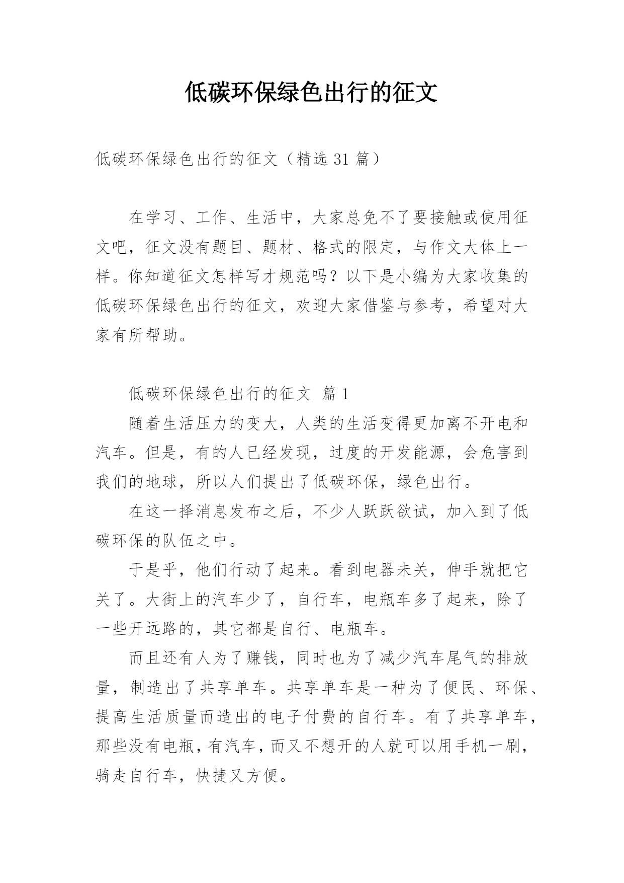 低碳环保绿色出行的征文低碳环保绿色出行的征文(精选31篇)在学习、工作、生活中,大家总免不了要接触或使用征文吧,征文没有题目、题材、格式的限定,与作文大体上一样。你知道征文怎样写才规范吗?以下是小编为大家收集的低碳环保绿色出行的征文,欢迎大家借鉴与参考,希望对大家有所帮助。低碳环保绿色出行的征文篇1随着生活压力的变大,人类的生活变得更加离不开电和汽车。但是,有的人已经发现,过度的开发能源,会危害到我们的地球,所以人们提出了低碳环保,绿色出行。在这一择消息发布之后,不少人跃跃欲试,加入到了低碳环保的队伍之中