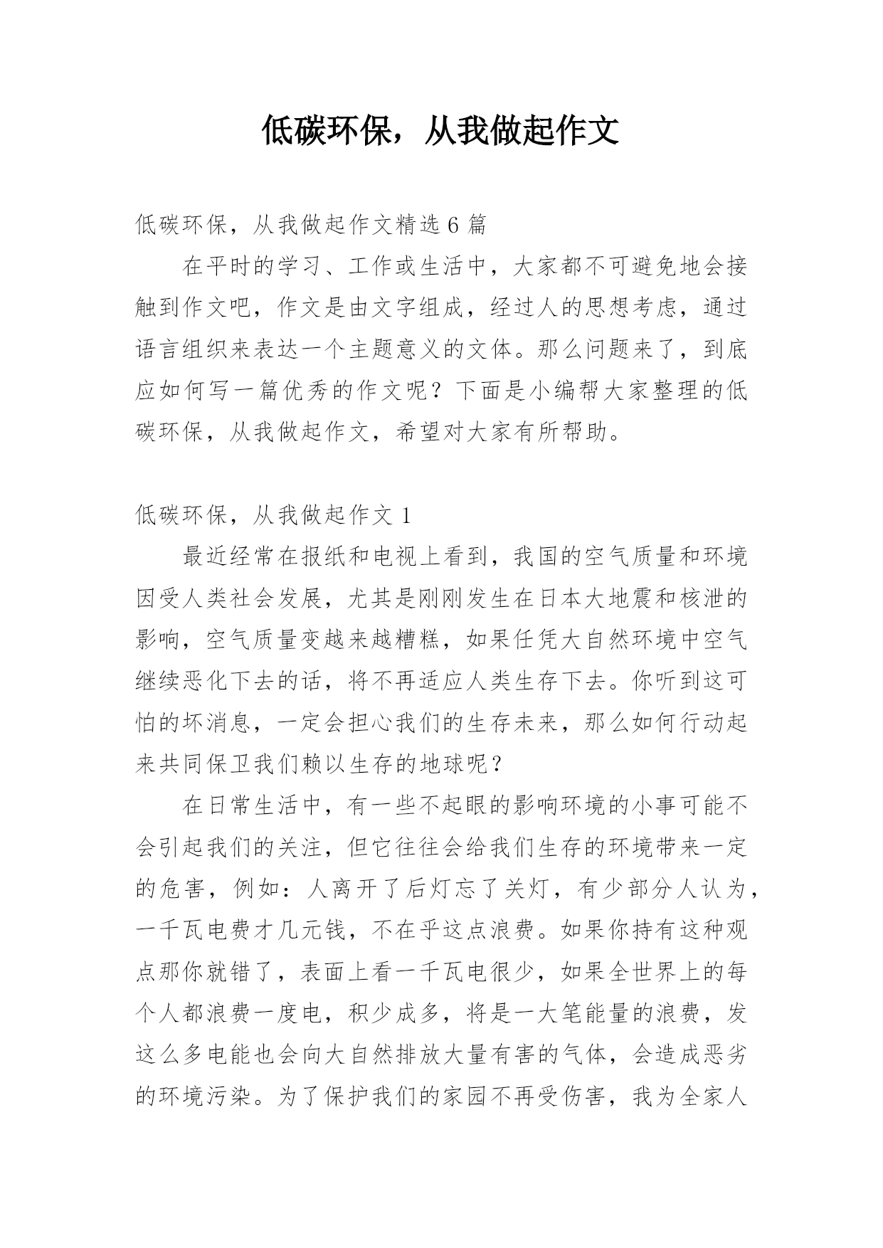 低碳环保,从我做起作文低碳环保,从我做起作文精选6篇在平时的学习、工作或生活中,大家都不可避免地会接触到作文吧,作文是由文字组成,经过人的思想考虑,通过语言组织来表达一个主题意义的文体。那么问题来了,到底应如何写一篇优秀的作文呢?下面是小编帮大家整理的低碳环保,从我做起作文,希望对大家有所帮助。低碳环保,从我做起作文1最近经常在报纸和电视上看到,我国的空气质量和环境因受人类社会发展,尤其是刚刚发生在日本大地震和核泄的影响,空气质量变越来越糟糕,如果任凭大自然环境中空气继续恶化下去的话,将不再适应人类生存下
