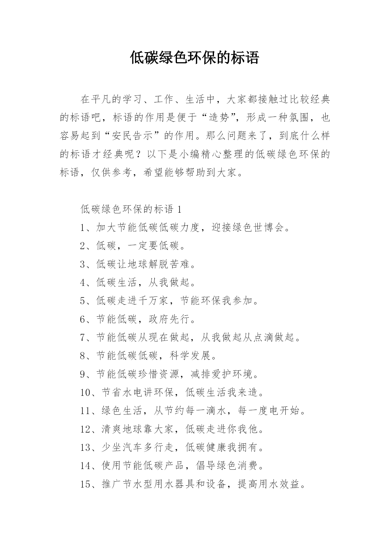 低碳绿色环保的标语在平凡的学习、工作、生活中,大家都接触过比较经典的标语吧,标语的作用是便于“造势”,形成一种氛围,也容易起到“安民告示”的作用。那么问题来了,到底什么样的标语才经典呢?以下是小编精心整理的低碳绿色环保的标语,仅供参考,希望能够帮助到大家。低碳绿色环保的标语11、加大节能低碳低碳力度,迎接绿色世博会。2、低碳,一定要低碳。3、低碳让地球解脱苦难。4、低碳生活,从我做起。5、低碳走进千万家,节能环保我参加。6、节能低碳,政府先行。7、节能低碳从现在做起,从我做起从点滴做起。8、节能低碳低碳,