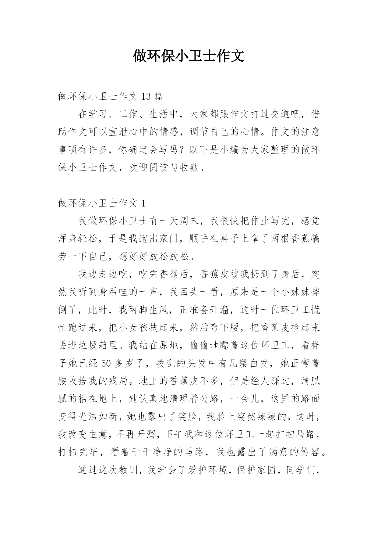 做环保小卫士作文做环保小卫士作文13篇在学习、工作、生活中,大家都跟作文打过交道吧,借助作文可以宣泄心中的情感,调节自己的心情。作文的注意事项有许多,你确定会写吗?以下是小编为大家整理的做环保小卫士作文,欢迎阅读与收藏。做环保小卫士作文1我做环保小卫士有一天周末,我很快把作业写完,感觉浑身轻松,于是我跑出家门,顺手在桌子上拿了两根香蕉犒劳一下自己,想好好放松放松。我边走边吃,吃完香蕉后,香蕉皮被我扔到了身后,突然我听到身后哇的一声,我回头一看,原来是一个小妹妹摔倒了,此时,我两脚生风,正准备开溜,这时一位