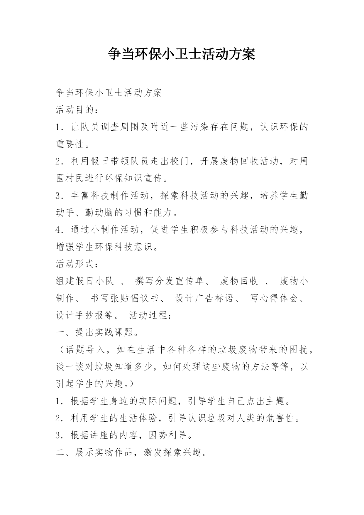争当环保小卫士活动方案争当环保小卫士活动方案活动目的:1.让队员调查周围及附近一些污染存在问题,认识环保的重要性。2.利用假日带领队员走出校门,开展废物回收活动,对周围村民进行环保知识宣传。3.丰富科技制作活动,探索科技活动的兴趣,培养学生勤动手、勤动脑的习惯和能力。4.通过小制作活动,促进学生积极参与科技活动的兴趣,增强学生环保科技意识。活动形式:组建假日小队、撰写分发宣传单、废物回收、废物小制作、书写张贴倡议书、设计广告标语、写心得体会、设计手抄报等。活动过程:一、提出实践课题。(话题导入,如在生活中