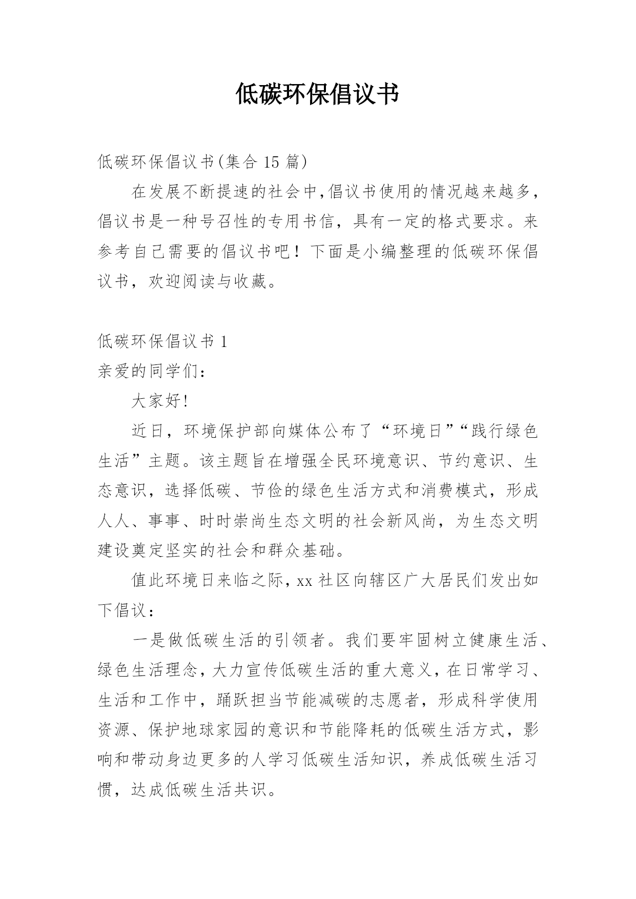 低碳环保倡议书低碳环保倡议书(集合15篇)在发展不断提速的社会中,倡议书使用的情况越来越多,倡议书是一种号召性的专用书信,具有一定的格式要求。来参考自己需要的倡议书吧!下面是小编整理的低碳环保倡议书,欢迎阅读与收藏。低碳环保倡议书1亲爱的同学们:大家好!近日,环境保护部向媒体公布了“环境日”“践行绿色生活”主题。该主题旨在增强全民环境意识、节约意识、生态意识,选择低碳、节俭的绿色生活方式和消费模式,形成人人、事事、时时崇尚生态文明的社会新风尚,为生态文明建设奠定坚实的社会和群众基础。值此环境日来临之际,x