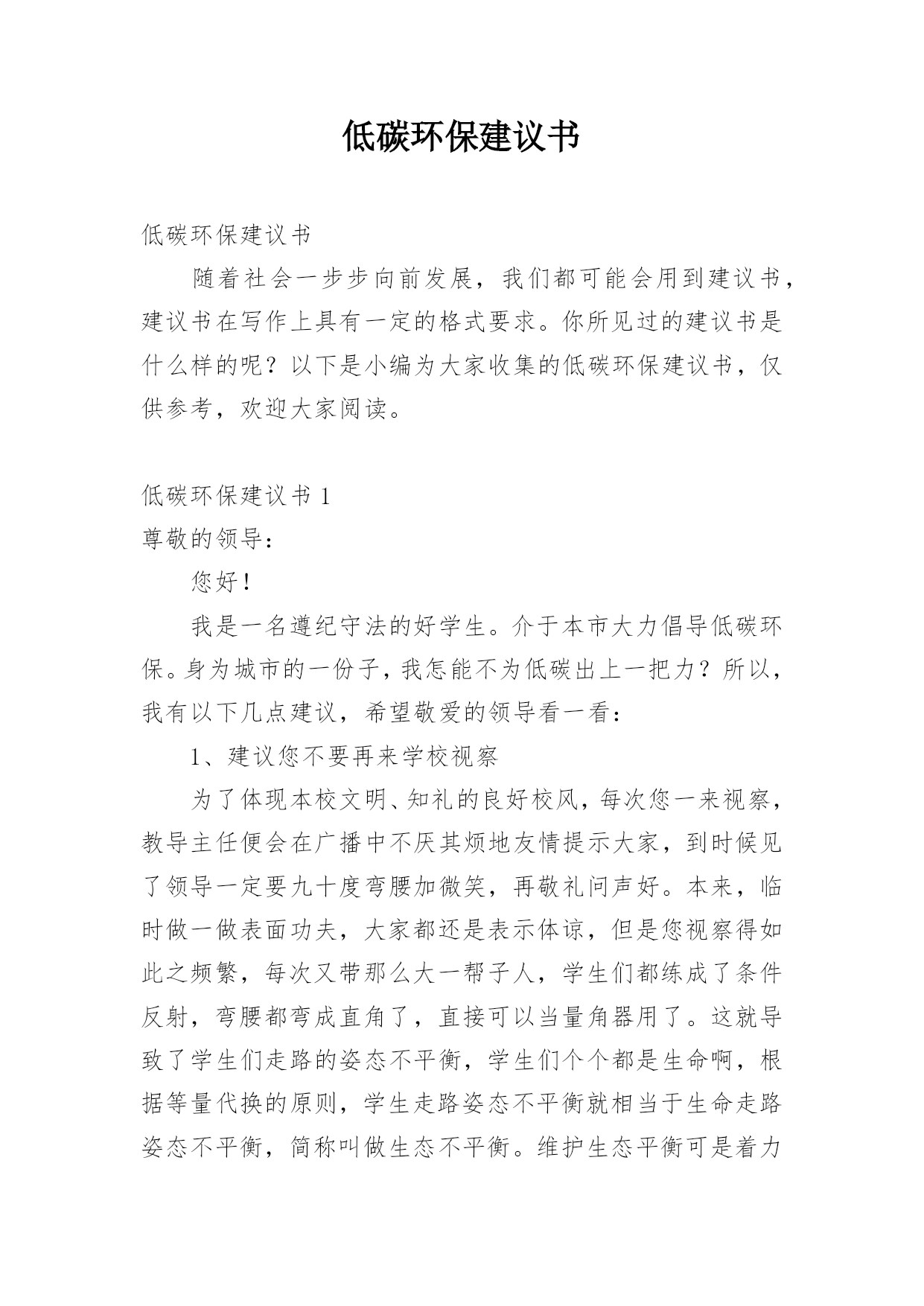 低碳环保建议书低碳环保建议书随着社会一步步向前发展,我们都可能会用到建议书,建议书在写作上具有一定的格式要求。你所见过的建议书是什么样的呢?以下是小编为大家收集的低碳环保建议书,仅供参考,欢迎大家阅读。低碳环保建议书1尊敬的领导:您好!我是一名遵纪守法的好学生。介于本市大力倡导低碳环保。身为城市的一份子,我怎能不为低碳出上一把力?所以,我有以下几点建议,希望敬爱的领导看一看:1、建议您不要再来学校视察为了体现本校文明、知礼的良好校风,每次您一来视察,教导主任便会在广播中不厌其烦地友情提示大家,到时候见了领