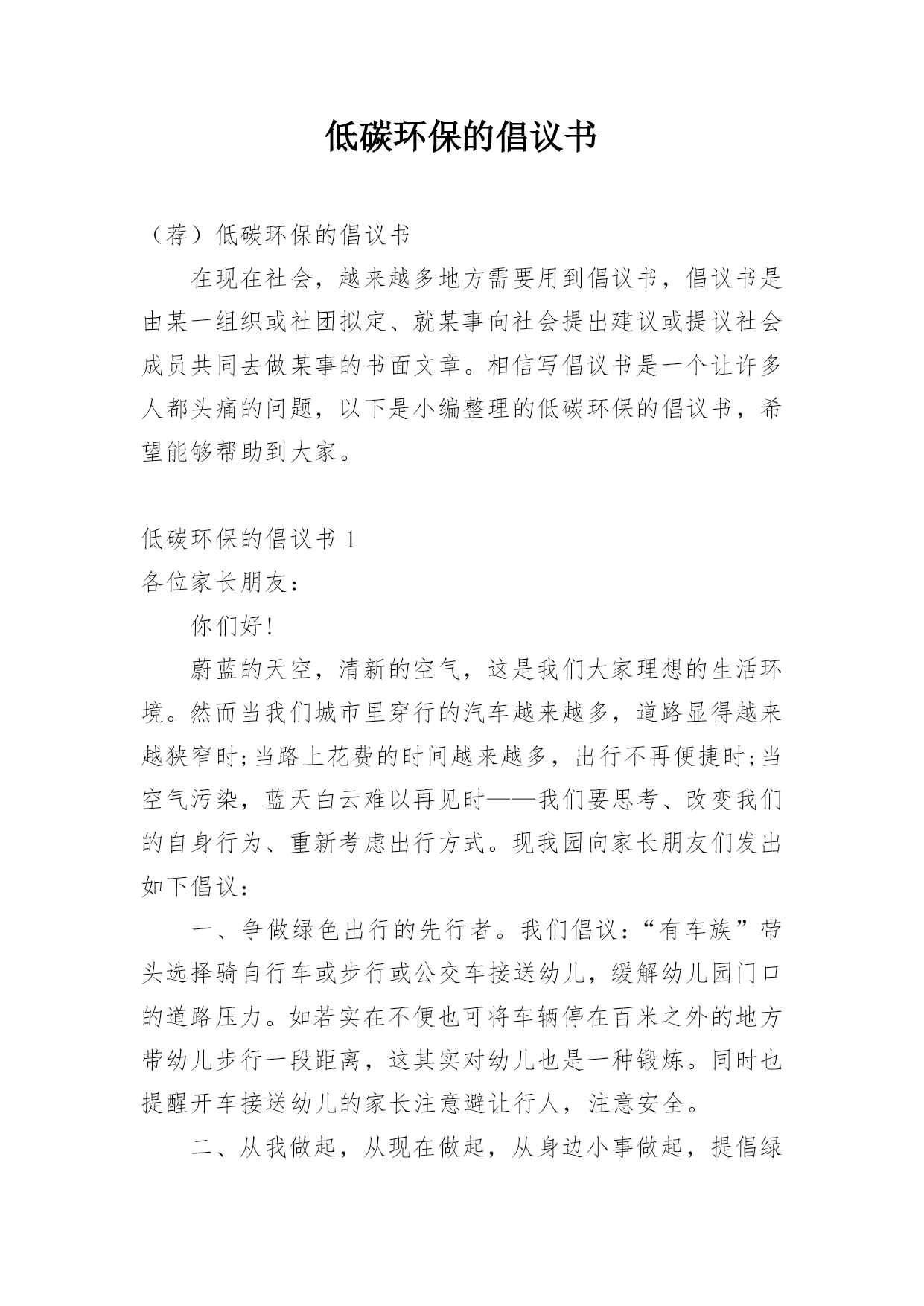 低碳环保的倡议书(荐)低碳环保的倡议书在现在社会,越来越多地方需要用到倡议书,倡议书是由某一组织或社团拟定、就某事向社会提出建议或提议社会成员共同去做某事的书面文章。相信写倡议书是一个让许多人都头痛的问题,以下是小编整理的低碳环保的倡议书,希望能够帮助到大家。低碳环保的倡议书1各位家长朋友:你们好!蔚蓝的天空,清新的空气,这是我们大家理想的生活环境。然而当我们城市里穿行的汽车越来越多,道路显得越来越狭窄时;当路上花费的时间越来越多,出行不再便捷时;当空气污染,蓝天白云难以再见时——我们要思考、改变我们的自