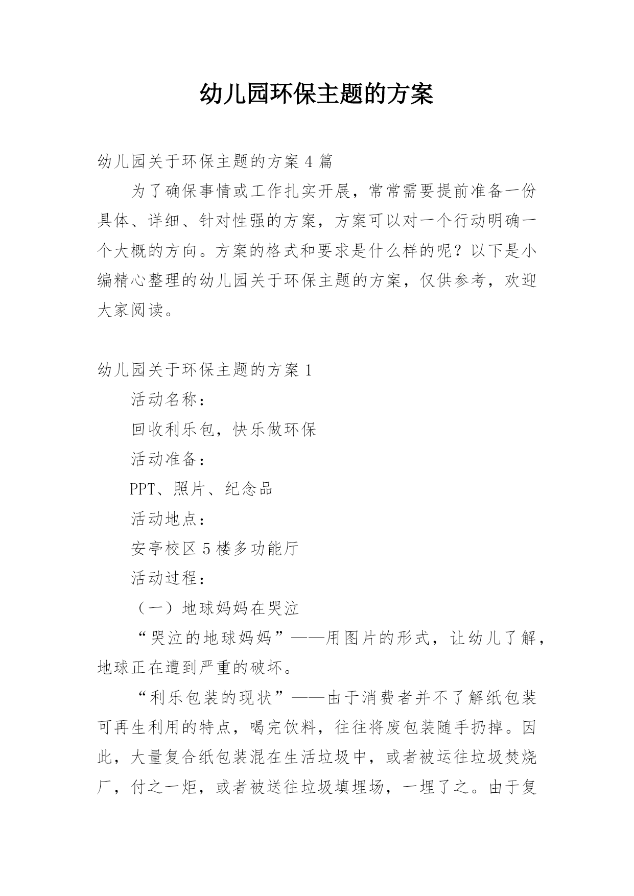 幼儿园环保主题的方案幼儿园关于环保主题的方案4篇为了确保事情或工作扎实开展,常常需要提前准备一份具体、详细、针对性强的方案,方案可以对一个行动明确一个大概的方向。方案的格式和要求是什么样的呢?以下是小编精心整理的幼儿园关于环保主题的方案,仅供参考,欢迎大家阅读。幼儿园关于环保主题的方案1活动名称:回收利乐包,快乐做环保活动准备:PPT、照片、纪念品活动地点:安亭校区5楼多功能厅活动过程:(一)地球妈妈在哭泣“哭泣的地球妈妈”——用图片的形式,让幼儿了解,地球正在遭到严重的破坏。“利乐包装的现状”——由于消
