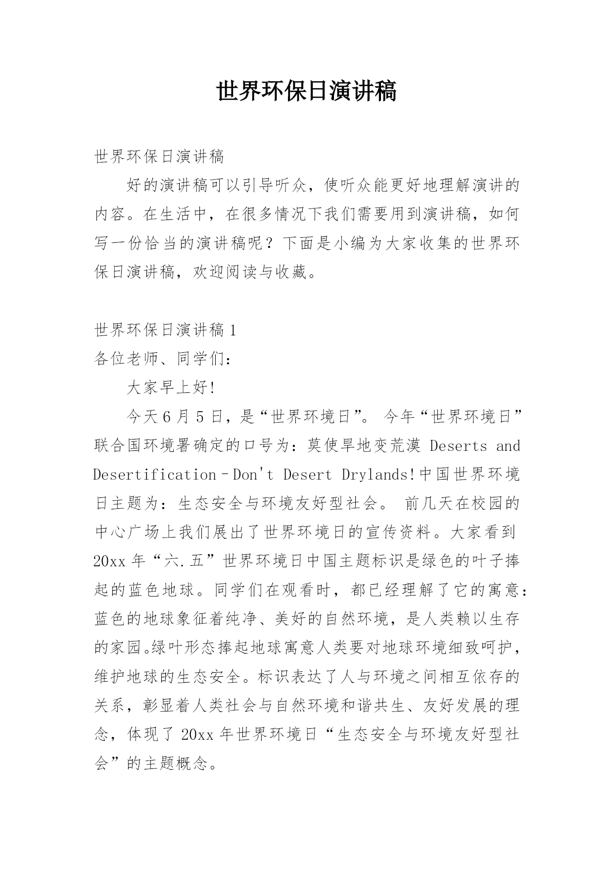 世界环保日演讲稿世界环保日演讲稿好的演讲稿可以引导听众,使听众能更好地理解演讲的内容。在生活中,在很多情况下我们需要用到演讲稿,如何写一份恰当的演讲稿呢?下面是小编为大家收集的世界环保日演讲稿,欢迎阅读与收藏。世界环保日演讲稿1各位老师、同学们:大家早上好!今天6月5日,是“世界环境日”。今年“世界环境日”联合国环境署确定的口号为:莫使旱地变荒漠DesertsandDesertification–Don'tDesertDrylands!中国世界环境日主题为:生态安全与环境友好型社会。前几天在校园的中心广场