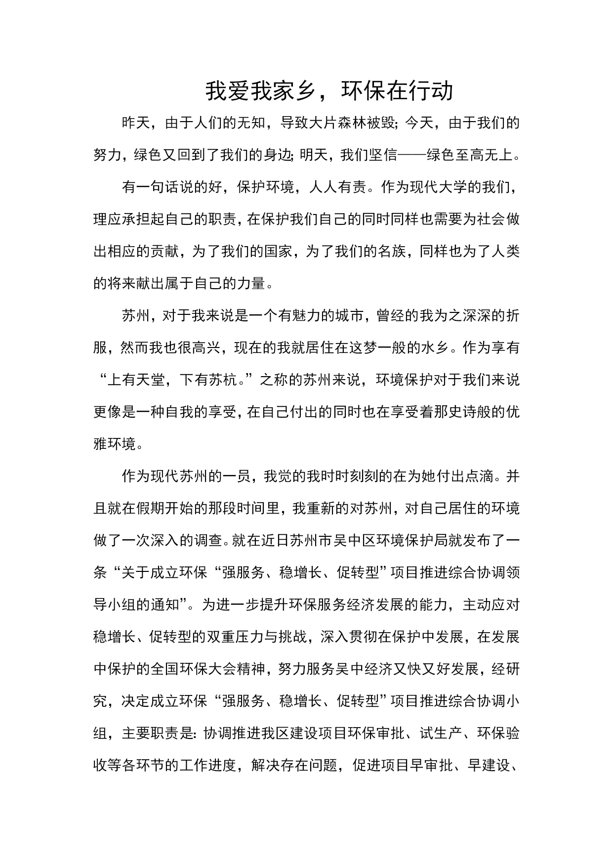 我爱我家乡,环保在行动昨天,由于人们的无知,导致大片森林被毁;今天,由于我们的努力,绿色又回到了我们的身边;明天,我们坚信——绿色至高无上。有一句话说的好,保护环境,人人有责。作为现代大学的我们,理应承担起自己的职责,在保护我们自己的同时同样也需要为社会做出相应的贡献,为了我们的国家,为了我们的名族,同样也为了人类的将来献出属于自己的力量。苏州,对于我来说是一个有魅力的城市,曾经的我为之深深的折服,然而我也很高兴,现在的我就居住在这梦一般的水乡。作为享有“上有天堂,下有苏杭。”之称的苏州来说,环境保护对于
