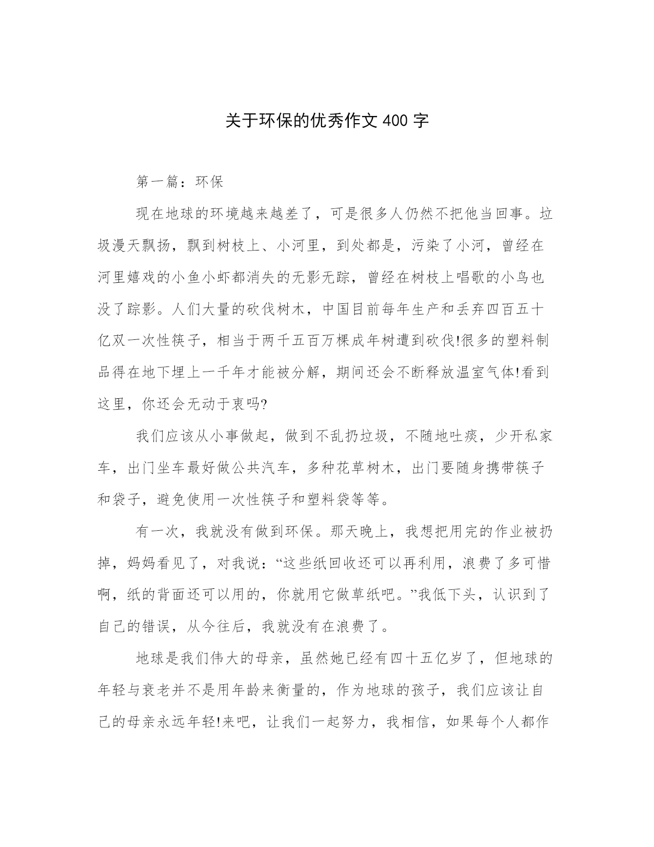 关于环保的优秀作文400字第一篇:环保现在地球的环境越来越差了,可是很多人仍然不把他当回事。垃圾漫天飘扬,飘到树枝上、小河里,到处都是,污染了小河,曾经在河里嬉戏的小鱼小虾都消失的无影无踪,曾经在树枝上唱歌的小鸟也没了踪影。人们大量的砍伐树木,中国目前每年生产和丢弃四百五十亿双一次性筷子,相当于两千五百万棵成年树遭到砍伐!很多的塑料制品得在地下埋上一千年才能被分解,期间还会不断释放温室气体!看到这里,你还会无动于衷吗?我们应该从小事做起,做到不乱扔垃圾,不随地吐痰,少开私家车,出门坐车最好做公共汽车,多种