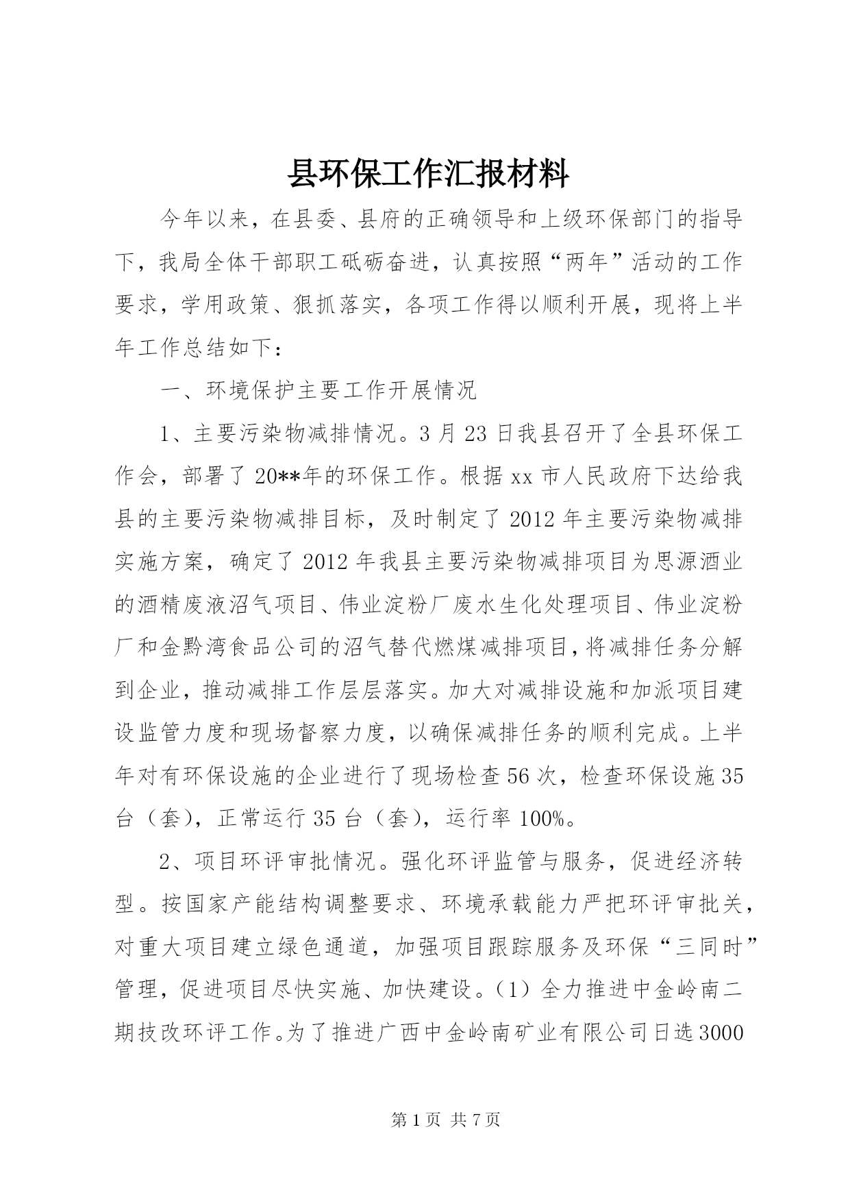 第PAGE\*Arabic\*MERGEFORMAT7页共NUMPAGES\*MERGEFORMAT7页县环保工作汇报材料今年以来,在县委、县府的正确领导和上级环保部门的指导下,我局全体干部职工砥砺奋进,认真按照“两年”活动的工作要求,学用政策、狠抓落实,各项工作得以顺利开展,现将上半年工作总结如下:一、环境保护主要工作开展情况1、主要污染物减排情况。3月23日我县召开了全县环保工作会,部署了20**年的环保工作。根据xx市人民政府下达给我县的主要污染物减排目标,及时制定了2012年主要污染物