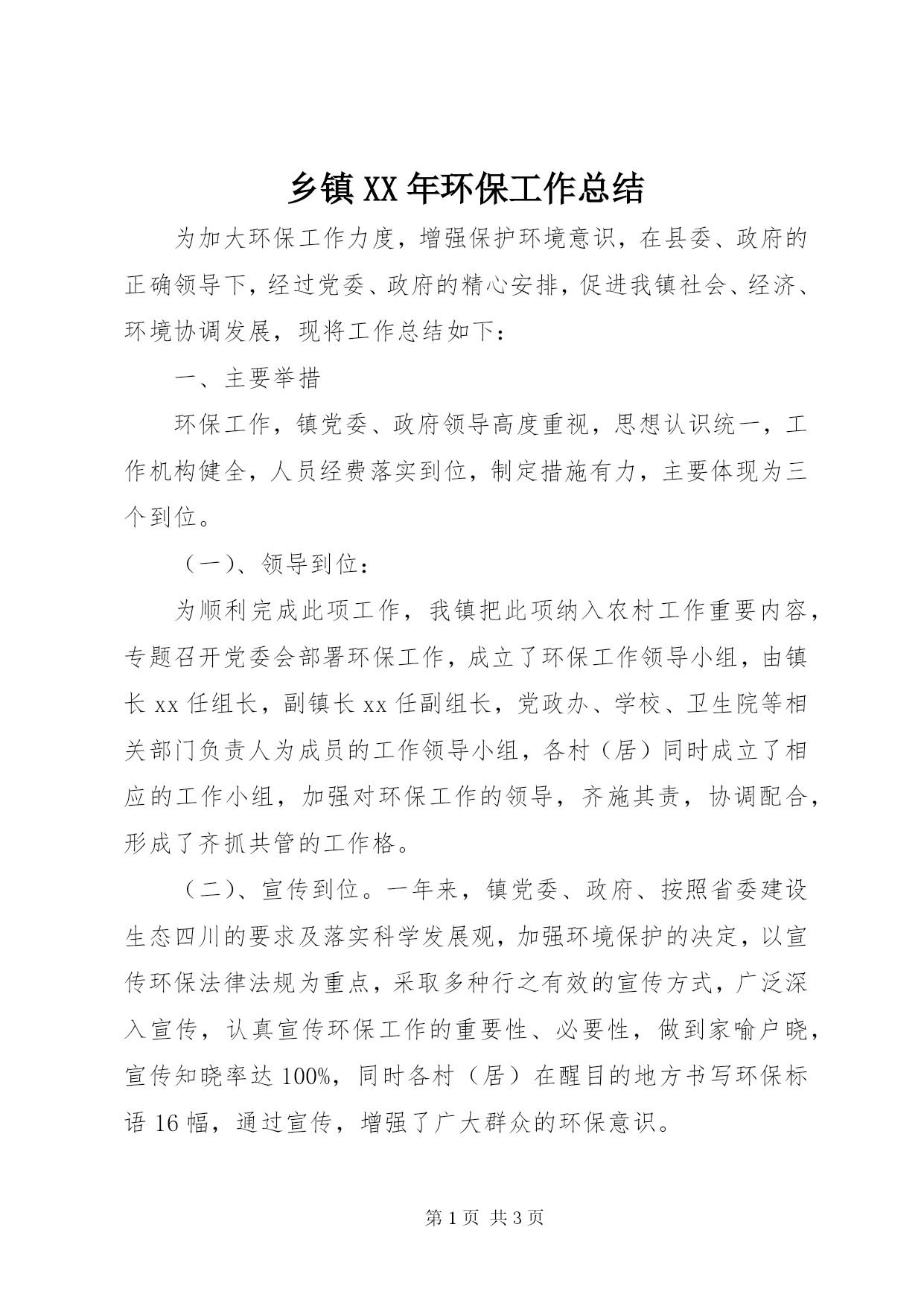 第PAGE\*Arabic\*MERGEFORMAT3页共NUMPAGES\*MERGEFORMAT3页乡镇XX年环保工作总结为加大环保工作力度,增强保护环境意识,在县委、政府的正确领导下,经过党委、政府的精心安排,促进我镇社会、经济、环境协调发展,现将工作总结如下:一、主要举措环保工作,镇党委、政府领导高度重视,思想认识统一,工作机构健全,人员经费落实到位,制定措施有力,主要体现为三个到位。(一)、领导到位:为顺利完成此项工作,我镇把此项纳入农村工作重要内容,专题召开党委会部署环保工作,成立