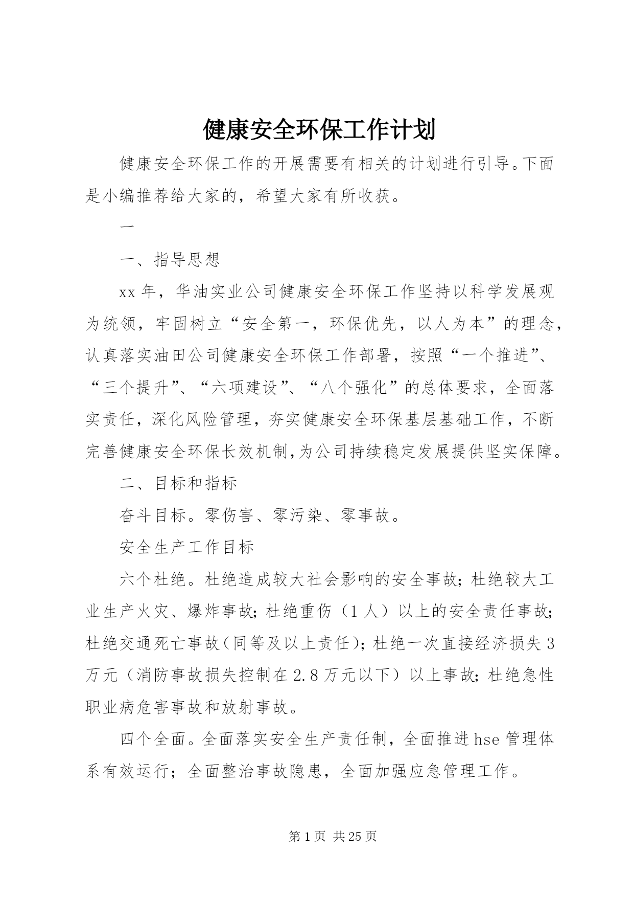 第PAGE\*Arabic\*MERGEFORMAT25页共NUMPAGES\*MERGEFORMAT25页健康安全环保工作计划健康安全环保工作的开展需要有相关的计划进行引导。下面是小编推荐给大家的,希望大家有所收获。一一、指导思想xx年,华油实业公司健康安全环保工作坚持以科学发展观为统领,牢固树立“安全第一,环保优先,以人为本”的理念,认真落实油田公司健康安全环保工作部署,按照“一个推进”、“三个提升”、“六项建设”、“八个强化”的总体要求,全面落实责任,深化风险管理,夯实健康安全环保基层基