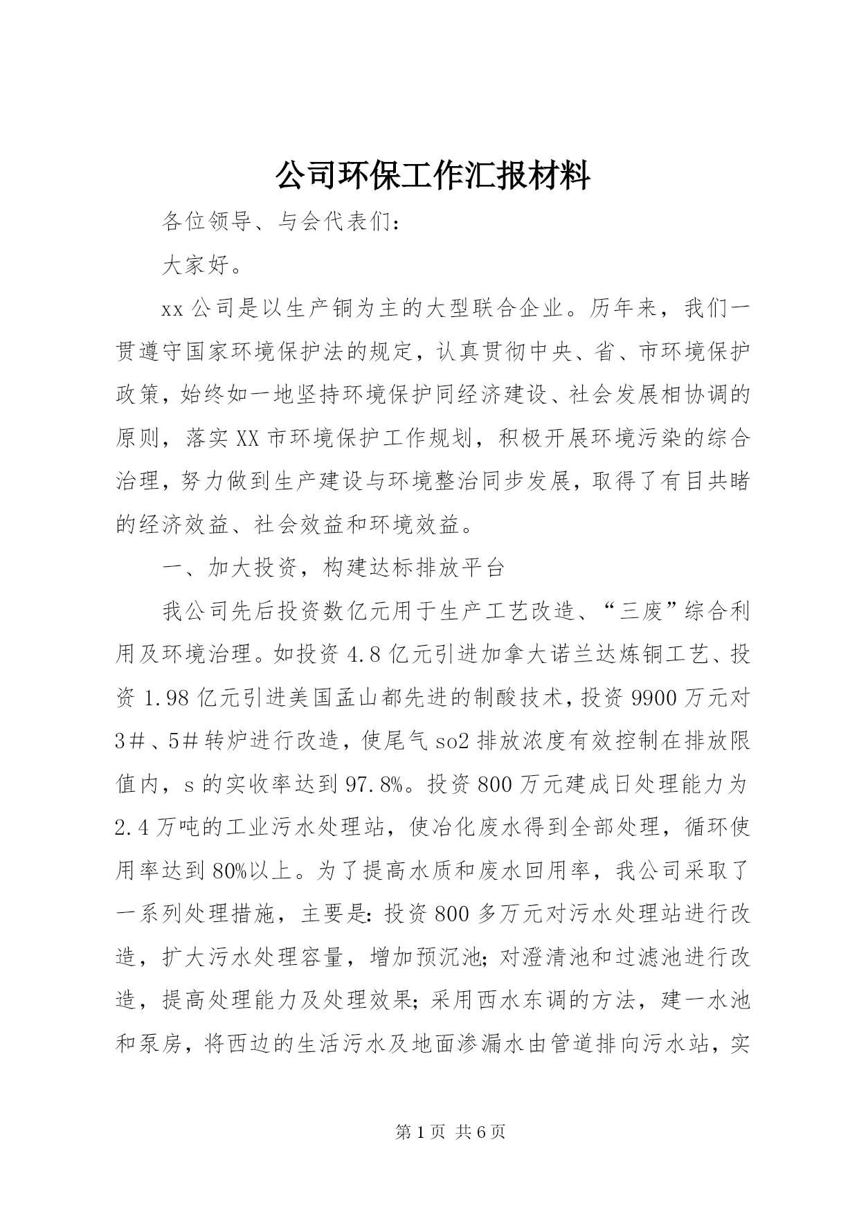 第PAGE\*Arabic\*MERGEFORMAT6页共NUMPAGES\*MERGEFORMAT6页公司环保工作汇报材料各位领导、与会代表们:大家好。xx公司是以生产铜为主的大型联合企业。历年来,我们一贯遵守国家环境保护法的规定,认真贯彻中央、省、市环境保护政策,始终如一地坚持环境保护同经济建设、社会发展相协调的原则,落实XX市环境保护工作规划,积极开展环境污染的综合治理,努力做到生产建设与环境整治同步发展,取得了有目共睹的经济效益、社会效益和环境效益。一、加大投资,构建达标排放平台我公司