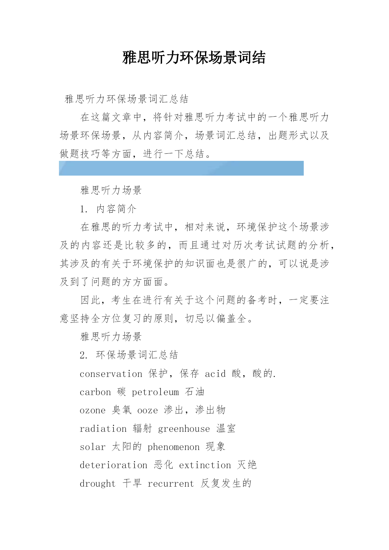 雅思听力环保场景词结雅思听力环保场景词汇总结在这篇文章中,将针对雅思听力考试中的一个雅思听力场景环保场景,从内容简介,场景词汇总结,出题形式以及做题技巧等方面,进行一下总结。雅思听力场景1.内容简介在雅思的听力考试中,相对来说,环境保护这个场景涉及的内容还是比较多的,而且通过对历次考试试题的分析,其涉及的有关于环境保护的知识面也是很广的,可以说是涉及到了问题的方方面面。因此,考生在进行有关于这个问题的备考时,一定要注意坚持全方位复习的原则,切忌以偏盖全。雅思听力场景2.环保场景词汇总结conservati