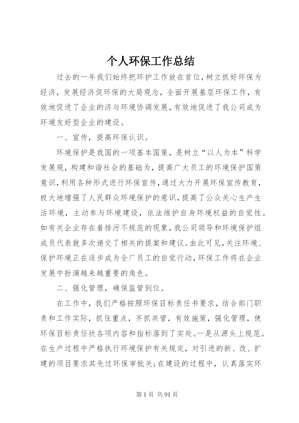 第PAGE\*Arabic\*MERGEFORMAT91页共NUMPAGES\*MERGEFORMAT91页个人环保工作总结过去的一年我们始终把环护工作放在首位,树立抓好环保为经济,发展经济促环保的大局观念,全面开展基层环保工作,有效地促进了企业的济与环境协调发展,有效地促进了我公司成为环境友好型企业的建设。一、宣传,提高环保认识。环境保护是我国的一项基本国策,是树立“以人为本”科学发展观,构建和谐社会的基础为,提高广大员工的环境保护国策意识,利用各种形式进行环保宣传,通过大力开展环保宣传教育
