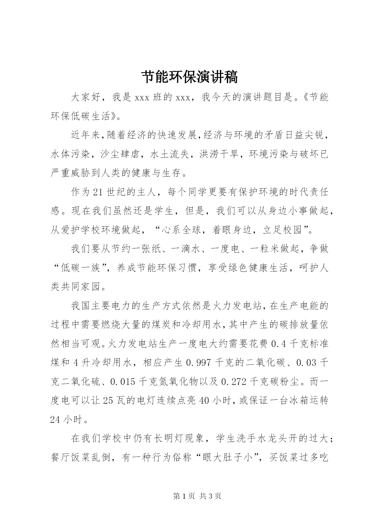 第PAGE\*Arabic\*MERGEFORMAT3页共NUMPAGES\*MERGEFORMAT3页节能环保演讲稿大家好,我是xxx班的xxx,我今天的演讲题目是。《节能环保低碳生活》。近年来,随着经济的快速发展,经济与环境的矛盾日益尖锐,水体污染,沙尘肆虐,水土流失,洪涝干旱,环境污染与破坏已严重威胁到人类的健康与生存。作为21世纪的主人,每个同学更要有保护环境的时代责任感。现在我们虽然还是学生,但是,我们可以从身边小事做起,从爱护学校环境做起,“心系全球,着眼身边,立足校园”。我们要从