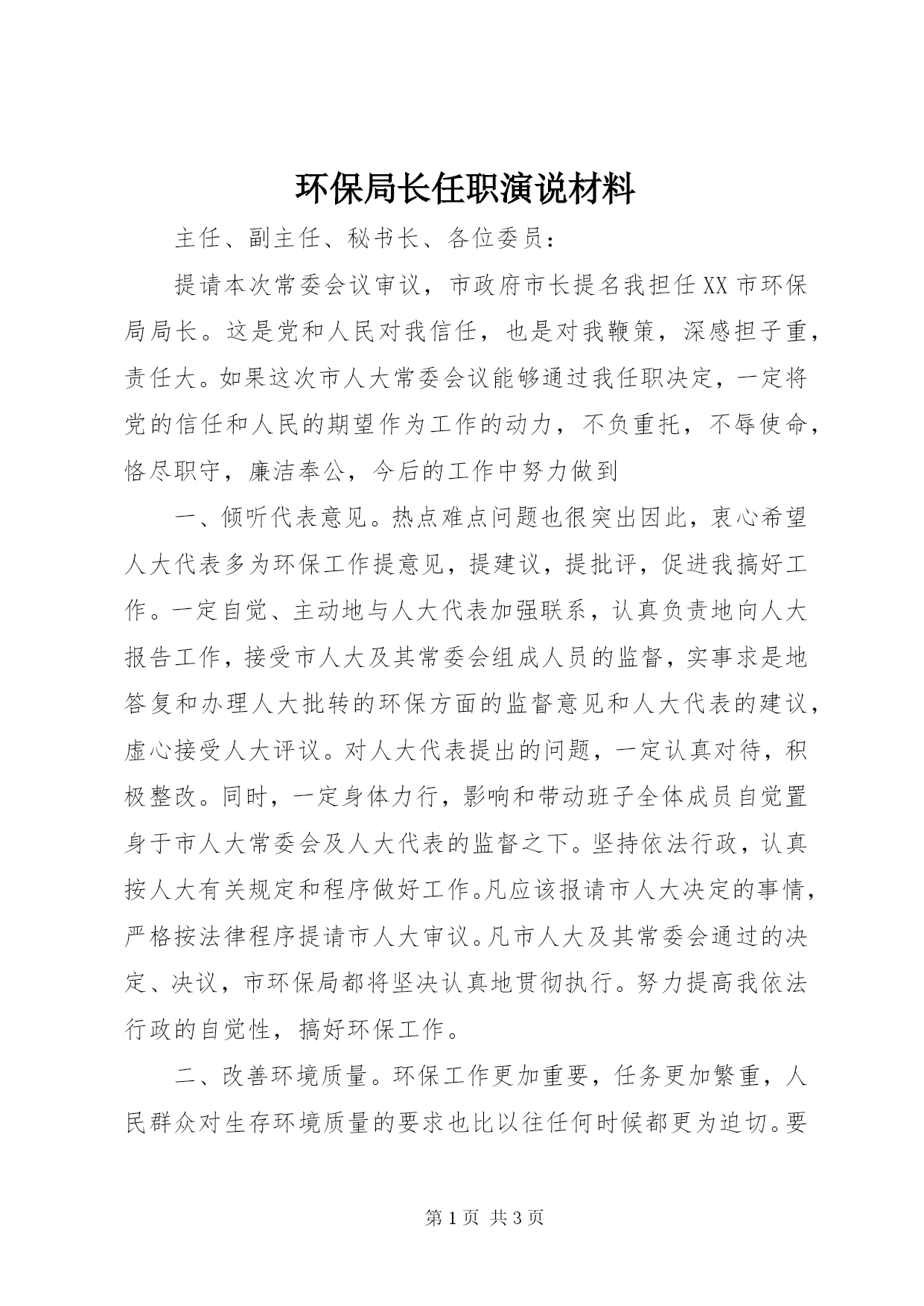 第PAGE\*Arabic\*MERGEFORMAT3页共NUMPAGES\*MERGEFORMAT3页环保局局长就职发言市政府www市长提名我担任XX市环保局局长,提请本次常委会议审议,这是党和人民对我的信任,也是对我的鞭策,我深感担子重,责任大。如果这次市人大常委会议能够通过我的任职决定,我一定将党的信任和人民的期望作为工作的动力,不负重托,不辱使命,恪尽职守,廉洁奉公,在今后的工作中努力做到:一、倾听代表意见,接受人大监督环保工作的焦点比较多,热点难点问题也很突出。因此,我衷心希望人大代