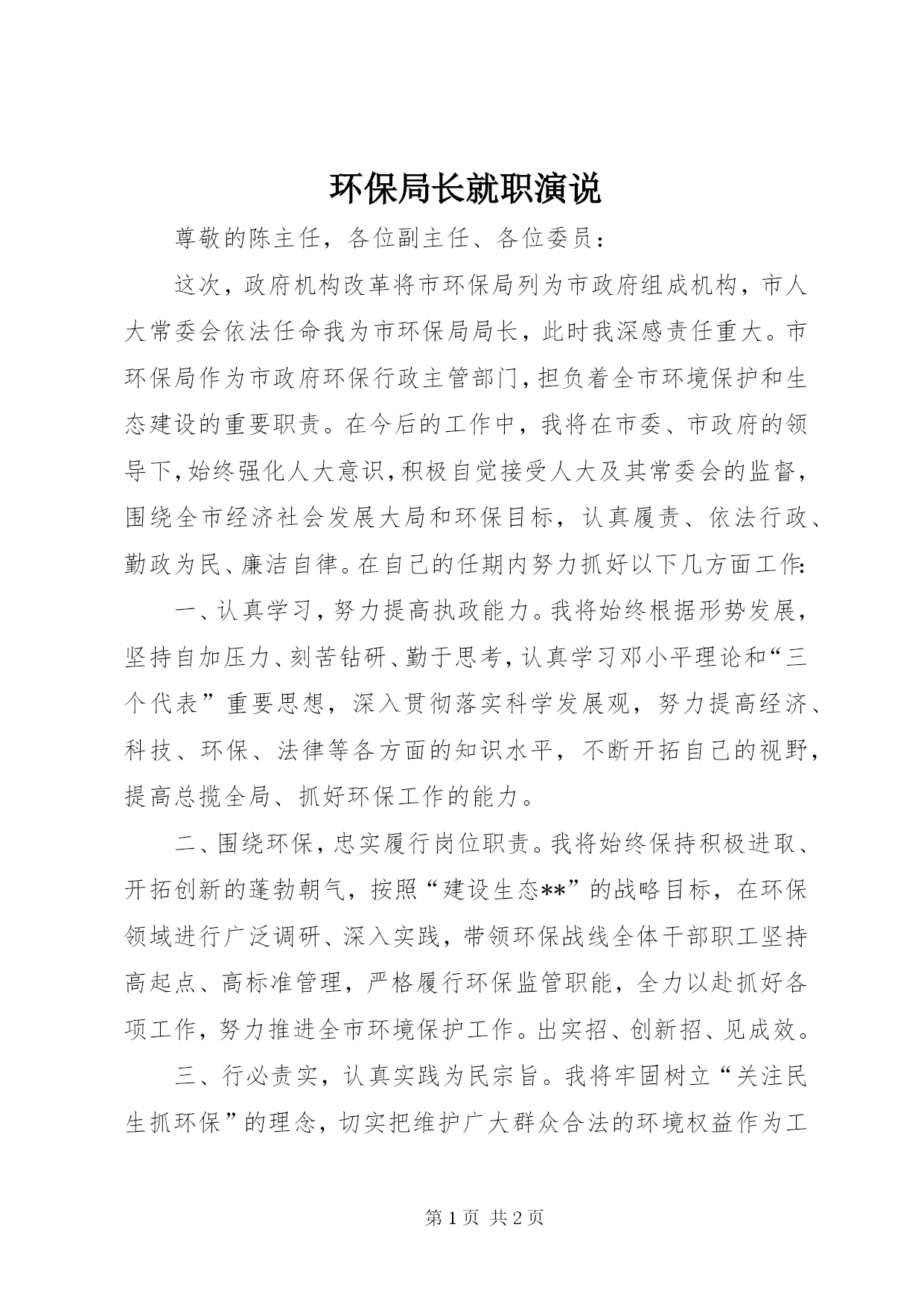 第PAGE\*Arabic\*MERGEFORMAT2页共NUMPAGES\*MERGEFORMAT2页环保局长就职演说尊敬的陈主任,各位副主任、各位委员:这次,政府机构改革将市环保局列为市政府组成机构,市人大常委会依法任命我为市环保局局长,此时我深感责任重大。市环保局作为市政府环保行政主管部门,担负着全市环境保护和生态建设的重要职责。在今后的工作中,我将在市委、市政府的领导下,始终强化人大意识,积极自觉接受人大及其常委会的监督,围绕全市经济社会发展大局和环保目标,认真履责、依法行政、勤政为民