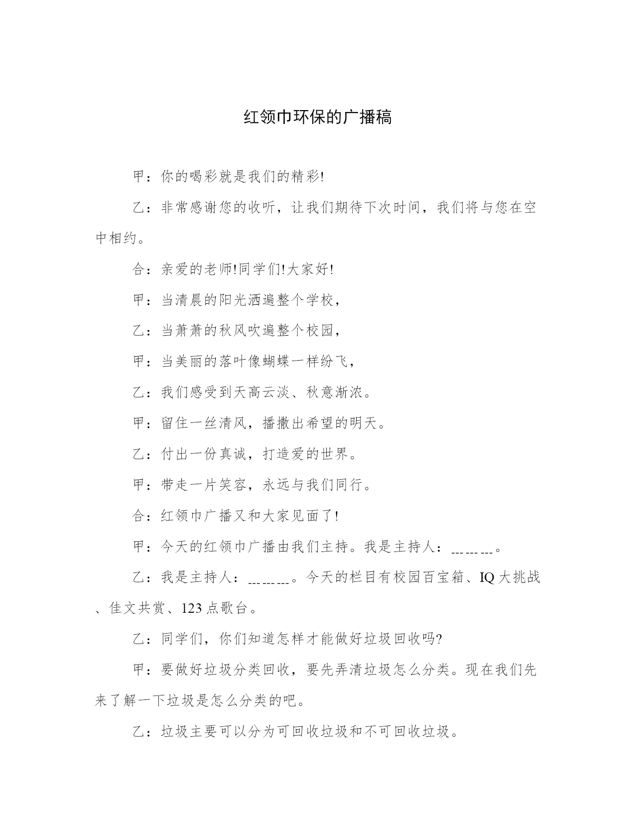 红领巾环保的广播稿甲:你的喝彩就是我们的精彩!乙:非常感谢您的收听,让我们期待下次时间,我们将与您在空中相约。合:亲爱的老师!同学们!大家好!甲:当清晨的阳光洒遍整个学校,乙:当萧萧的秋风吹遍整个校园,甲:当美丽的落叶像蝴蝶一样纷飞,乙:我们感受到天高云淡、秋意渐浓。甲:留住一丝清风,播撒出希望的明天。乙:付出一份真诚,打造爱的世界。甲:带走一片笑容,永远与我们同行。合:红领巾广播又和大家见面了!甲:今天的红领巾广播由我们主持。我是主持人:﹍﹍﹍。乙:我是主持人:﹍﹍﹍。今天的栏目有校园百宝箱、IQ大挑战