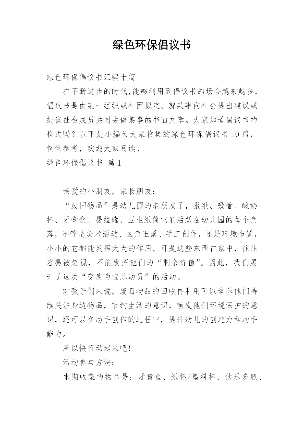 绿色环保倡议书绿色环保倡议书汇编十篇在不断进步的时代,能够利用到倡议书的场合越来越多,倡议书是由某一组织或社团拟定、就某事向社会提出建议或提议社会成员共同去做某事的书面文章。大家知道倡议书的格式吗?以下是小编为大家收集的绿色环保倡议书10篇,仅供参考,欢迎大家阅读。绿色环保倡议书篇1亲爱的小朋友,家长朋友:“废旧物品”是幼儿园的老朋友了,报纸、吸管、酸奶杯、牙膏盒、易拉罐、卫生纸筒它们活跃在幼儿园的每个角落,不管是美术活动、区角玉溪、手工创作,还是环境布置,小小的它都能发挥大大的作用。可是这些东西在家中,