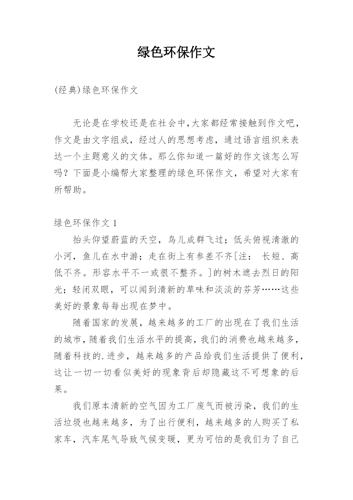 绿色环保作文(经典)绿色环保作文无论是在学校还是在社会中,大家都经常接触到作文吧,作文是由文字组成,经过人的思想考虑,通过语言组织来表达一个主题意义的文体。那么你知道一篇好的作文该怎么写吗?下面是小编帮大家整理的绿色环保作文,希望对大家有所帮助。绿色环保作文1抬头仰望蔚蓝的天空,鸟儿成群飞过;低头俯视清澈的小河,鱼儿在水中游;走在街上有参差不齐[注:长短、高低不齐。形容水平不一或很不整齐。]的树木遮去烈日的阳光;轻闭双眼,可以闻到清新的草味和淡淡的芬芳……这些美好的景象每每出现在梦中。随着国家的发展,越来