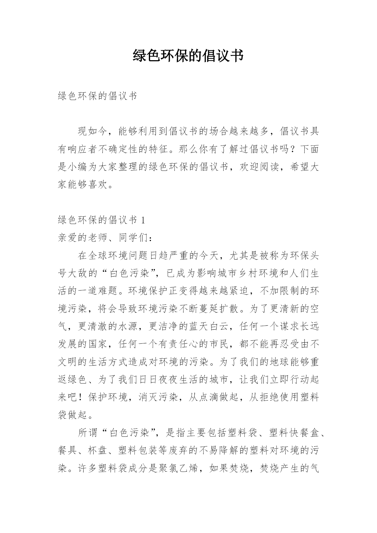 绿色环保的倡议书绿色环保的倡议书现如今,能够利用到倡议书的场合越来越多,倡议书具有响应者不确定性的特征。那么你有了解过倡议书吗?下面是小编为大家整理的绿色环保的倡议书,欢迎阅读,希望大家能够喜欢。绿色环保的倡议书1亲爱的老师、同学们:在全球环境问题日趋严重的今天,尤其是被称为环保头号大敌的“白色污染”,已成为影响城市乡村环境和人们生活的一道难题。环境保护正变得越来越紧迫,不加限制的环境污染,将会导致环境污染不断蔓延扩散。为了更清新的空气,更清澈的水源,更洁净的蓝天白云,任何一个谋求长远发展的国家,任何一个