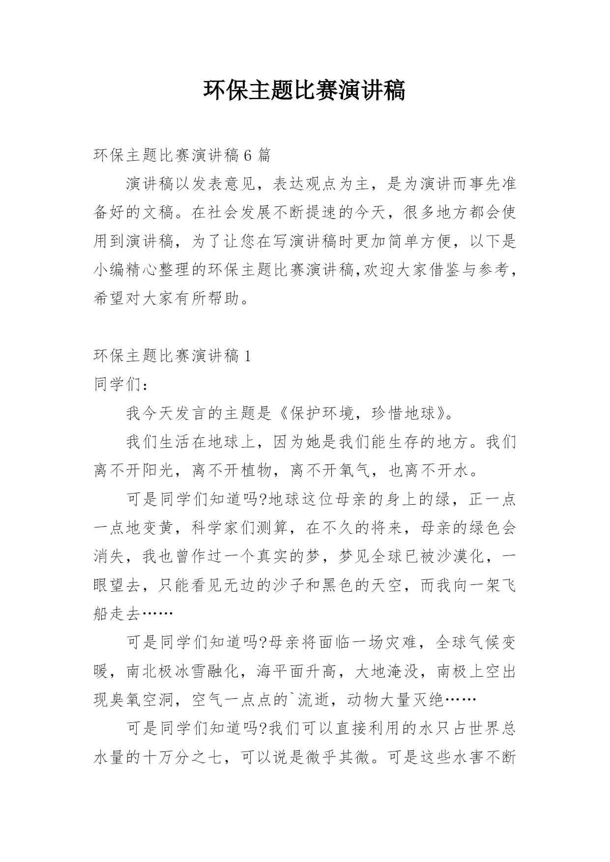 环保主题比赛演讲稿环保主题比赛演讲稿6篇演讲稿以发表意见,表达观点为主,是为演讲而事先准备好的文稿。在社会发展不断提速的今天,很多地方都会使用到演讲稿,为了让您在写演讲稿时更加简单方便,以下是小编精心整理的环保主题比赛演讲稿,欢迎大家借鉴与参考,希望对大家有所帮助。环保主题比赛演讲稿1同学们:我今天发言的主题是《保护环境,珍惜地球》。我们生活在地球上,因为她是我们能生存的地方。我们离不开阳光,离不开植物,离不开氧气,也离不开水。可是同学们知道吗?地球这位母亲的身上的绿,正一点一点地变黄,科学家们测算,在不