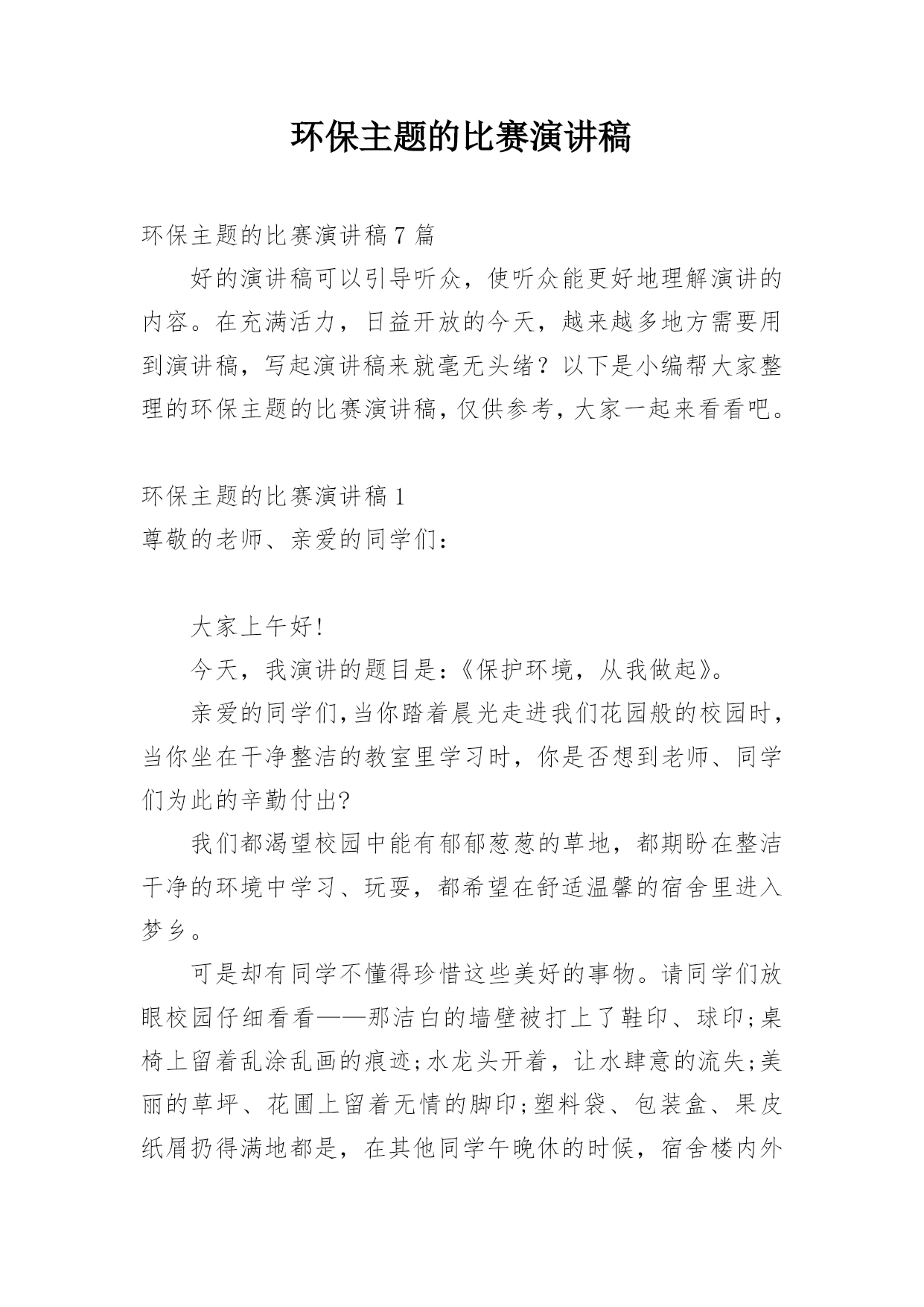 环保主题的比赛演讲稿环保主题的比赛演讲稿7篇好的演讲稿可以引导听众,使听众能更好地理解演讲的内容。在充满活力,日益开放的今天,越来越多地方需要用到演讲稿,写起演讲稿来就毫无头绪?以下是小编帮大家整理的环保主题的比赛演讲稿,仅供参考,大家一起来看看吧。环保主题的比赛演讲稿1尊敬的老师、亲爱的同学们:大家上午好!今天,我演讲的题目是:《保护环境,从我做起》。亲爱的同学们,当你踏着晨光走进我们花园般的校园时,当你坐在干净整洁的教室里学习时,你是否想到老师、同学们为此的辛勤付出?我们都渴望校园中能有郁郁葱葱的草地