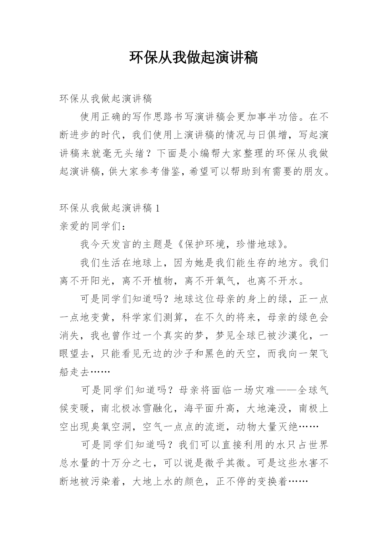 环保从我做起演讲稿环保从我做起演讲稿使用正确的写作思路书写演讲稿会更加事半功倍。在不断进步的时代,我们使用上演讲稿的情况与日俱增,写起演讲稿来就毫无头绪?下面是小编帮大家整理的环保从我做起演讲稿,供大家参考借鉴,希望可以帮助到有需要的朋友。环保从我做起演讲稿1亲爱的同学们:我今天发言的主题是《保护环境,珍惜地球》。我们生活在地球上,因为她是我们能生存的地方。我们离不开阳光,离不开植物,离不开氧气,也离不开水。可是同学们知道吗?地球这位母亲的身上的绿,正一点一点地变黄,科学家们测算,在不久的将来,母亲的绿色