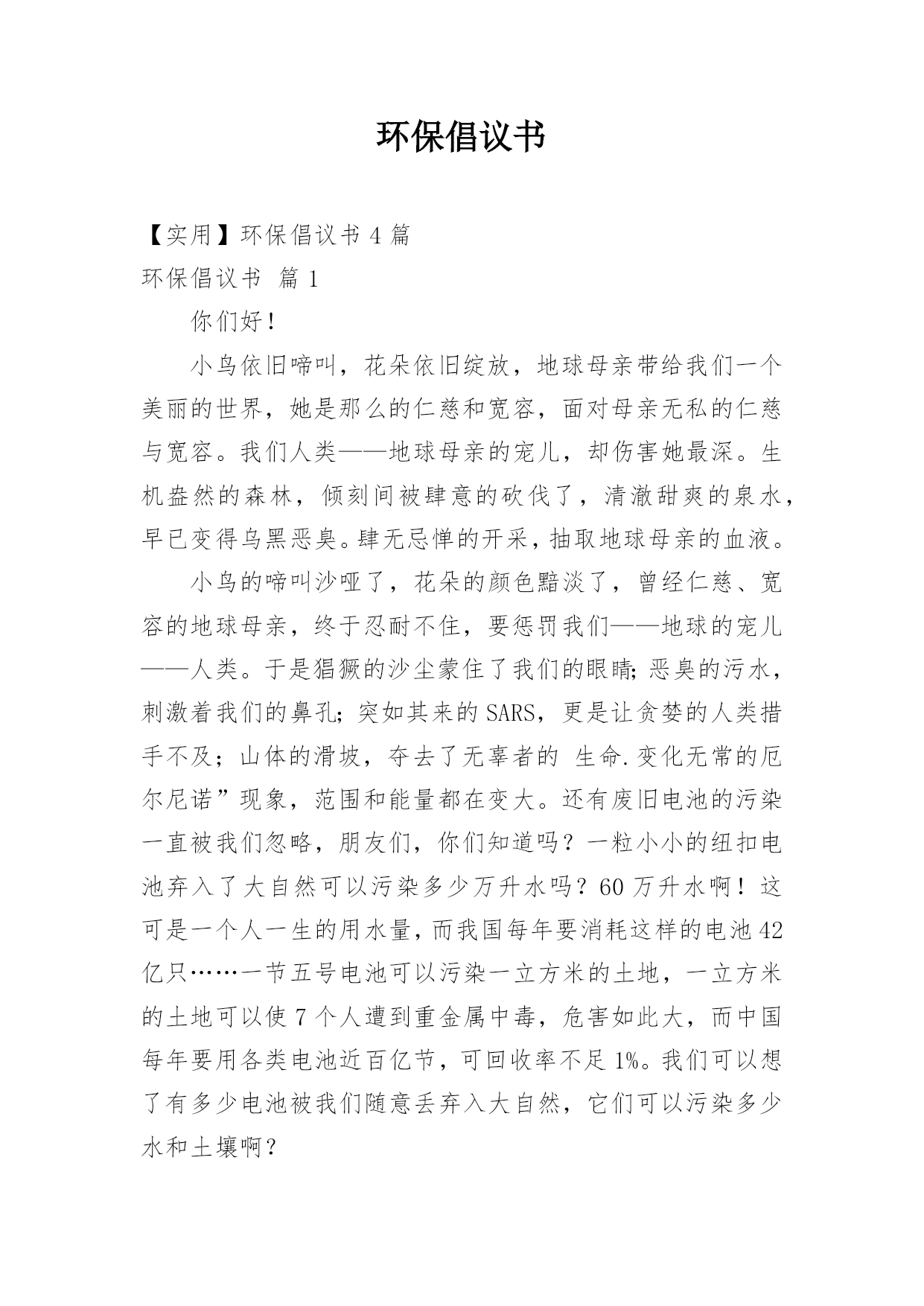 环保倡议书【实用】环保倡议书4篇环保倡议书篇1你们好!小鸟依旧啼叫,花朵依旧绽放,地球母亲带给我们一个美丽的世界,她是那么的仁慈和宽容,面对母亲无私的仁慈与宽容。我们人类——地球母亲的宠儿,却伤害她最深。生机盎然的森林,倾刻间被肆意的砍伐了,清澈甜爽的泉水,早已变得乌黑恶臭。肆无忌惮的开采,抽取地球母亲的血液。小鸟的啼叫沙哑了,花朵的颜色黯淡了,曾经仁慈、宽容的地球母亲,终于忍耐不住,要惩罚我们——地球的宠儿——人类。于是猖獗的沙尘蒙住了我们的眼睛;恶臭的污水,刺激着我们的鼻孔;突如其来的SARS,更是让