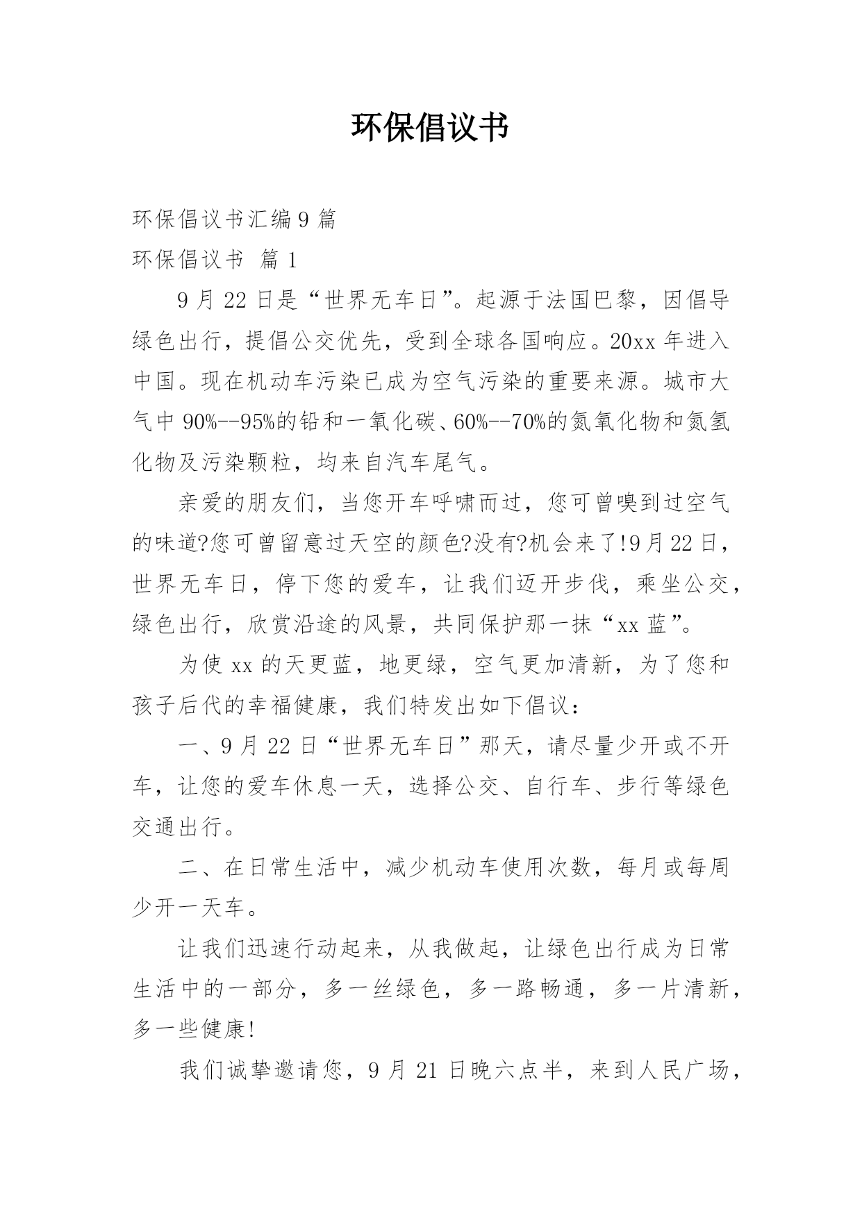 环保倡议书环保倡议书汇编9篇环保倡议书篇19月22日是“世界无车日”。起源于法国巴黎,因倡导绿色出行,提倡公交优先,受到全球各国响应。20xx年进入中国。现在机动车污染已成为空气污染的重要来源。城市大气中90%--95%的铅和一氧化碳、60%--70%的氮氧化物和氮氢化物及污染颗粒,均来自汽车尾气。亲爱的朋友们,当您开车呼啸而过,您可曾嗅到过空气的味道?您可曾留意过天空的颜色?没有?机会来了!9月22日,世界无车日,停下您的爱车,让我们迈开步伐,乘坐公交,绿色出行,欣赏沿途的风景,共同保护那一抹“xx蓝”