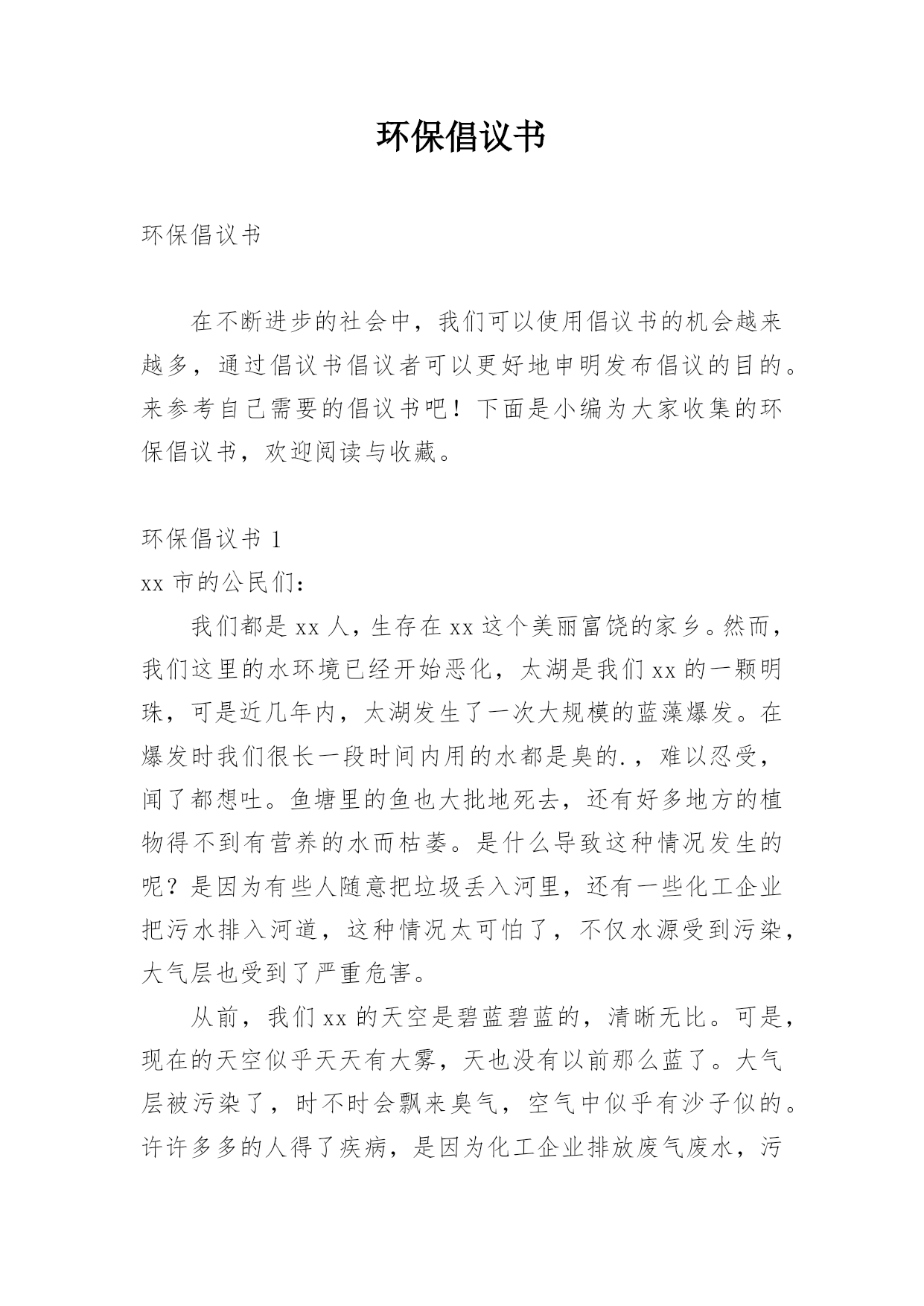 环保倡议书环保倡议书在不断进步的社会中,我们可以使用倡议书的机会越来越多,通过倡议书倡议者可以更好地申明发布倡议的目的。来参考自己需要的倡议书吧!下面是小编为大家收集的环保倡议书,欢迎阅读与收藏。环保倡议书1xx市的公民们:我们都是xx人,生存在xx这个美丽富饶的家乡。然而,我们这里的水环境已经开始恶化,太湖是我们xx的一颗明珠,可是近几年内,太湖发生了一次大规模的蓝藻爆发。在爆发时我们很长一段时间内用的水都是臭的.,难以忍受,闻了都想吐。鱼塘里的鱼也大批地死去,还有好多地方的植物得不到有营养的水而枯萎。