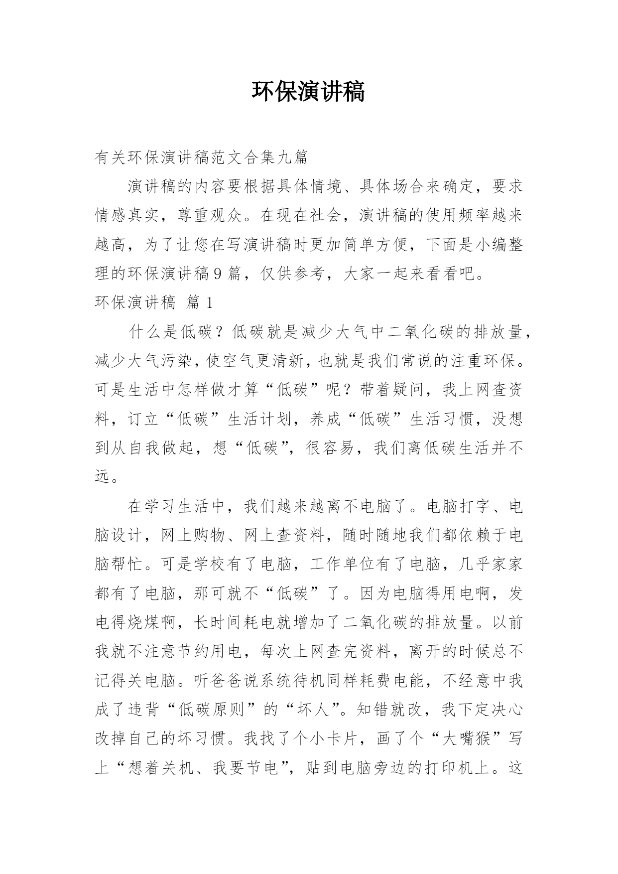 环保演讲稿有关环保演讲稿范文合集九篇演讲稿的内容要根据具体情境、具体场合来确定,要求情感真实,尊重观众。在现在社会,演讲稿的使用频率越来越高,为了让您在写演讲稿时更加简单方便,下面是小编整理的环保演讲稿9篇,仅供参考,大家一起来看看吧。环保演讲稿篇1什么是低碳?低碳就是减少大气中二氧化碳的排放量,减少大气污染,使空气更清新,也就是我们常说的注重环保。可是生活中怎样做才算“低碳”呢?带着疑问,我上网查资料,订立“低碳”生活计划,养成“低碳”生活习惯,没想到从自我做起,想“低碳”,很容易,我们离低碳生活并不远