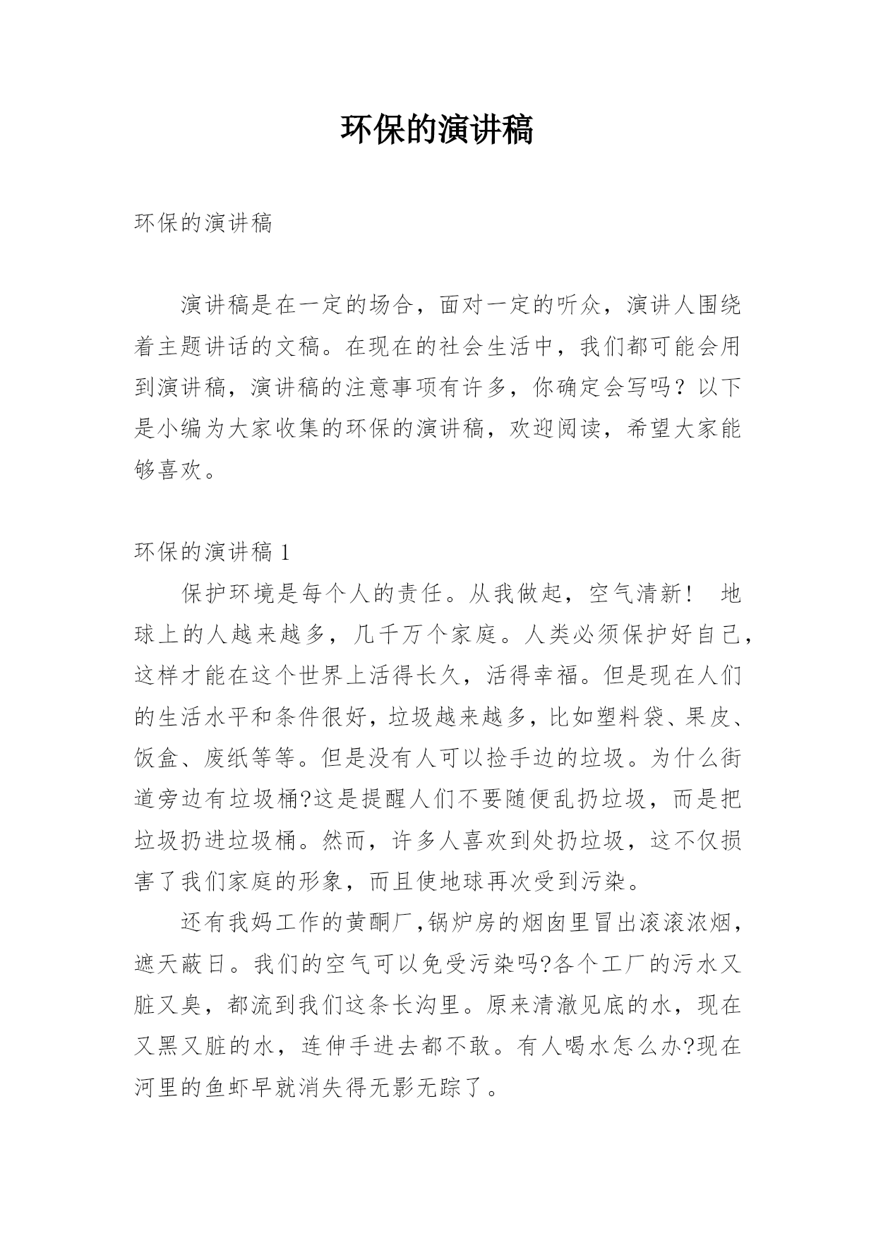 环保的演讲稿环保的演讲稿演讲稿是在一定的场合,面对一定的听众,演讲人围绕着主题讲话的文稿。在现在的社会生活中,我们都可能会用到演讲稿,演讲稿的注意事项有许多,你确定会写吗?以下是小编为大家收集的环保的演讲稿,欢迎阅读,希望大家能够喜欢。环保的演讲稿1保护环境是每个人的责任。从我做起,空气清新!地球上的人越来越多,几千万个家庭。人类必须保护好自己,这样才能在这个世界上活得长久,活得幸福。但是现在人们的生活水平和条件很好,垃圾越来越多,比如塑料袋、果皮、饭盒、废纸等等。但是没有人可以捡手边的垃圾。为什么街道旁