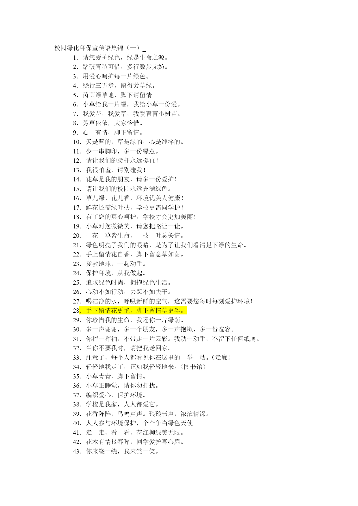 校园绿化环保宣传语集锦(一)_1.请您爱护绿色,绿是生命之源。2.踏破青毡可惜,多行数步无妨。3.用爱心呵护每一片绿色。4.绕行三五步,留得芳草绿。5.茵茵绿草地,脚下请留情。6.小草给我一片绿,我给小草一份爱。7.我爱花,我爱草,我爱青青小树苗。8.芳草依依,大家怜惜。9.心中有情,脚下留情。10.天是蓝的,草是绿的,心是纯粹的。11.少一串脚印,多一份绿意。12.请让我们的腰杆永远挺直!13.我很怕羞,请别碰我!14.花草是我的朋友,请多一份爱护!15.请让我们的校园永远充满绿色。16.草儿绿、花儿香