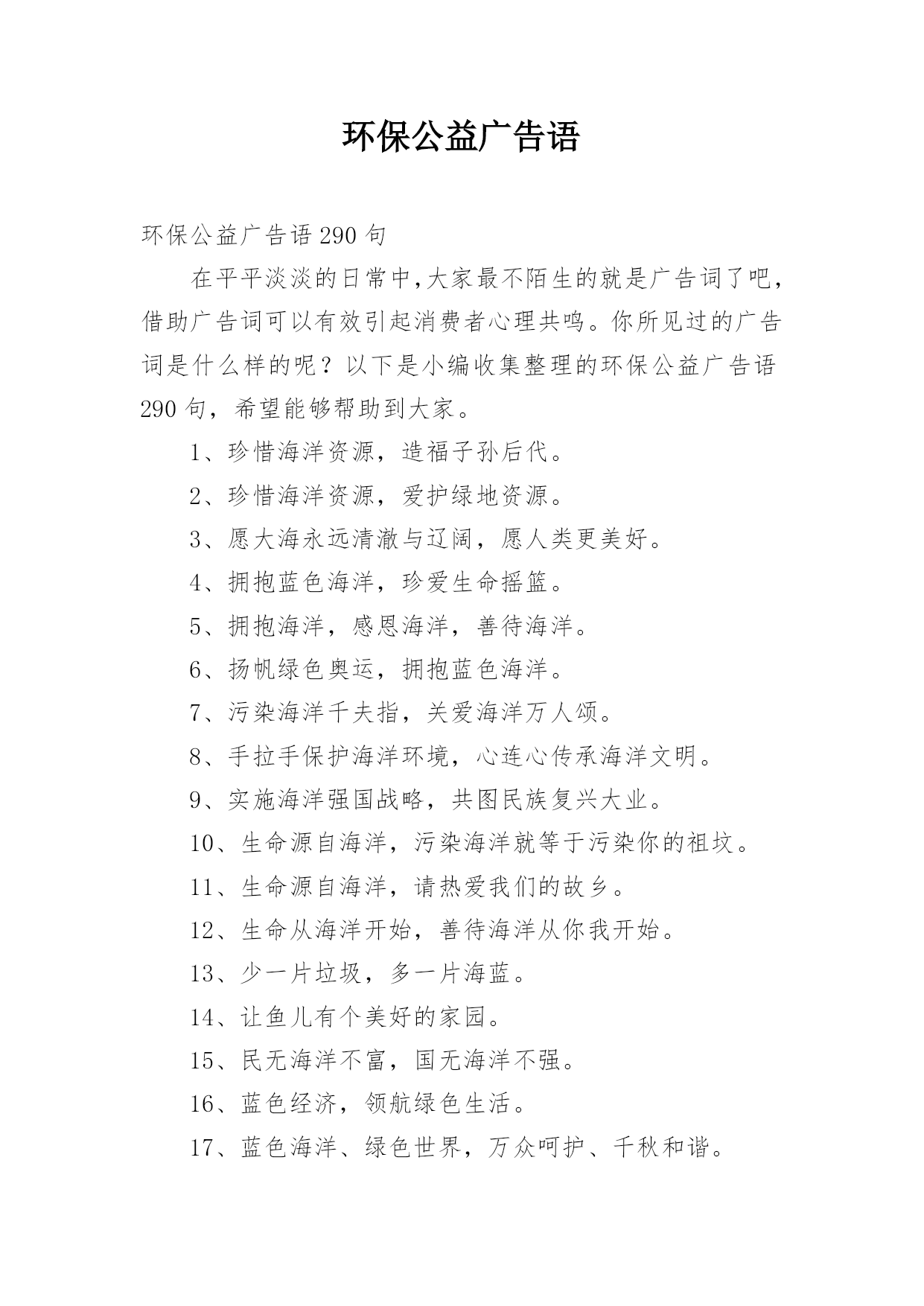 环保公益广告语环保公益广告语290句在平平淡淡的日常中,大家最不陌生的就是广告词了吧,借助广告词可以有效引起消费者心理共鸣。你所见过的广告词是什么样的呢?以下是小编收集整理的环保公益广告语290句,希望能够帮助到大家。1、珍惜海洋资源,造福子孙后代。2、珍惜海洋资源,爱护绿地资源。3、愿大海永远清澈与辽阔,愿人类更美好。4、拥抱蓝色海洋,珍爱生命摇篮。5、拥抱海洋,感恩海洋,善待海洋。6、扬帆绿色奥运,拥抱蓝色海洋。7、污染海洋千夫指,关爱海洋万人颂。8、手拉手保护海洋环境,心连心传承海洋文明。9、实施海