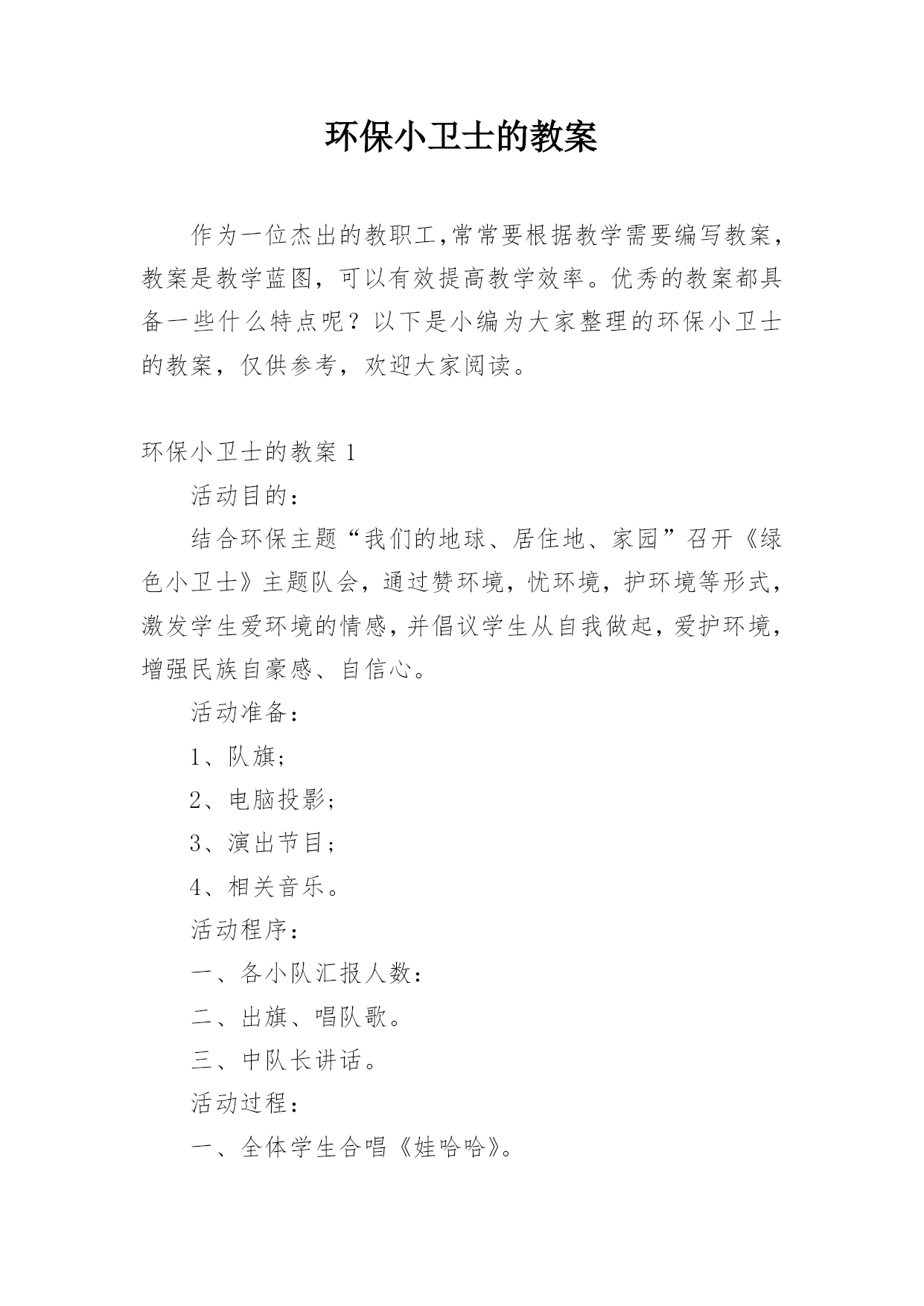 环保小卫士的教案作为一位杰出的教职工,常常要根据教学需要编写教案,教案是教学蓝图,可以有效提高教学效率。优秀的教案都具备一些什么特点呢?以下是小编为大家整理的环保小卫士的教案,仅供参考,欢迎大家阅读。环保小卫士的教案1活动目的:结合环保主题“我们的地球、居住地、家园”召开《绿色小卫士》主题队会,通过赞环境,忧环境,护环境等形式,激发学生爱环境的情感,并倡议学生从自我做起,爱护环境,增强民族自豪感、自信心。活动准备:1、队旗;2、电脑投影;3、演出节目;4、相关音乐。活动程序:一、各小队汇报人数:二、出旗、