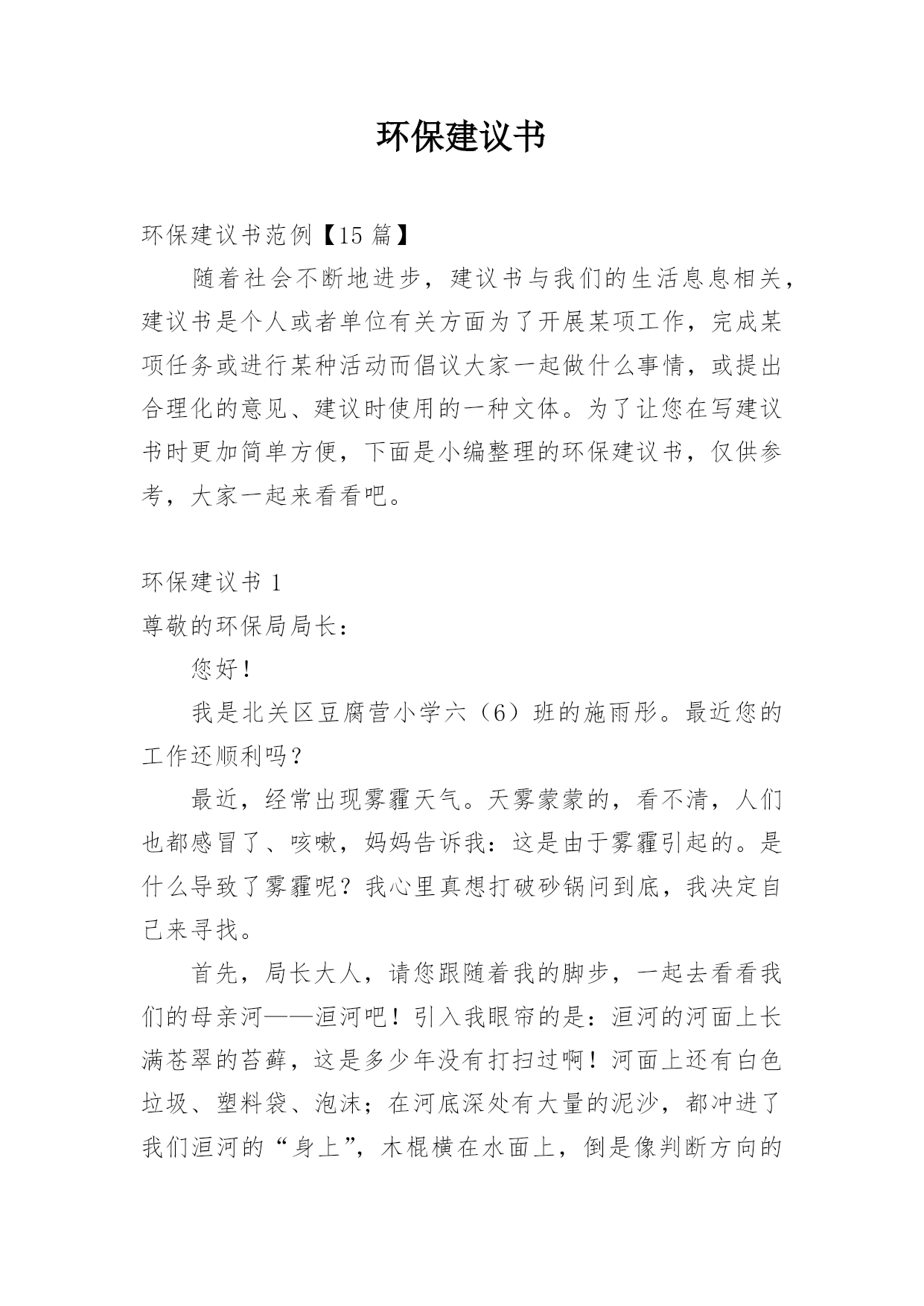 环保建议书环保建议书范例【15篇】随着社会不断地进步,建议书与我们的生活息息相关,建议书是个人或者单位有关方面为了开展某项工作,完成某项任务或进行某种活动而倡议大家一起做什么事情,或提出合理化的意见、建议时使用的一种文体。为了让您在写建议书时更加简单方便,下面是小编整理的环保建议书,仅供参考,大家一起来看看吧。环保建议书1尊敬的环保局局长:您好!我是北关区豆腐营小学六(6)班的施雨彤。最近您的工作还顺利吗?最近,经常出现雾霾天气。天雾蒙蒙的,看不清,人们也都感冒了、咳嗽,妈妈告诉我:这是由于雾霾引起的。是